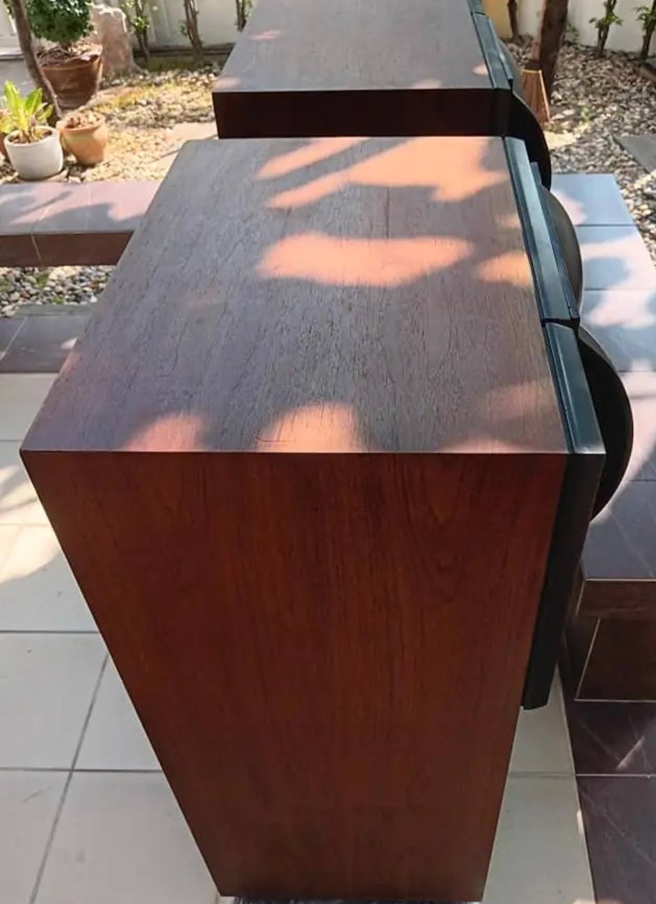 The material is 22 mm thick hard particle board, and the exterior is walnut finished.