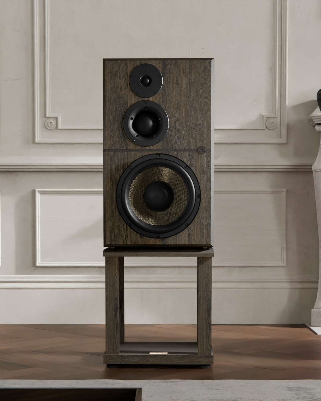 การออกแบบระดับพรีเมียม: ตัวตู้ทำจากผิวไม้โอ๊ครมควัน (Smoked Oak) พร้อมแผงกั้นด้านหน้าเทคโนโลยี StrataBaffle™ ซึ่งใช้ไม้โอ๊คเนื้อแข็งหลายชั้นเพื่อความแข็งแรงและควบคุมเสียงสะท้อนได้ดีขึ้น