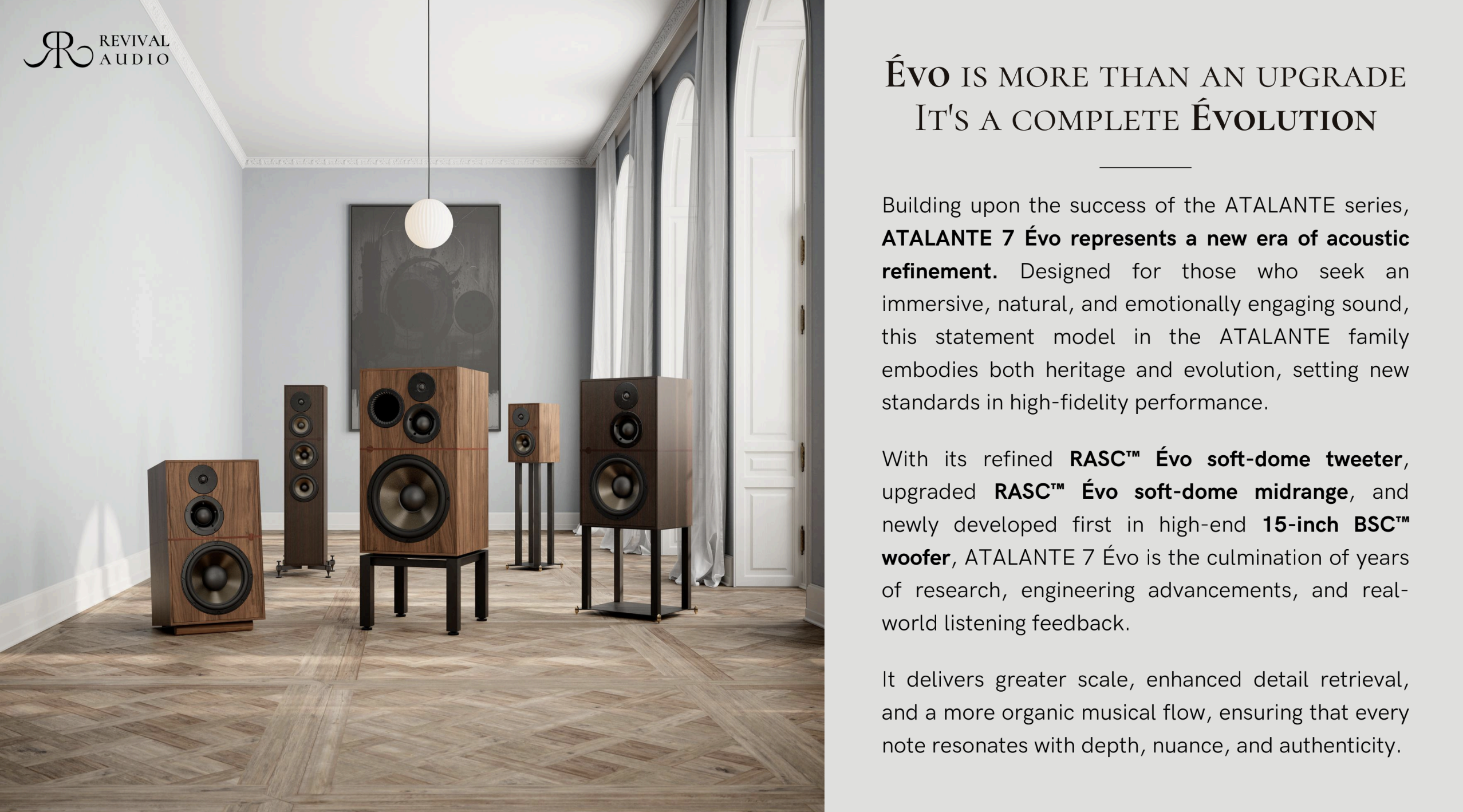 ลำโพงไฮเอนด์รุ่นพิเศษ (Flagship) จากแบรนด์ Revival Audio ประเทศฝรั่งเศส ซึ่งผลิตออกมาในจำนวนจำกัดเพียง 300 คู่ทั่วโลก โดยเป็นการนำความสำเร็จของรุ่น ATALANTE 5 มาอัปเกรดประสิทธิภาพในทุกด้านเพื่อความเป็นที่สุด