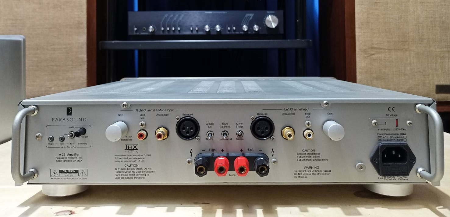 ขายเพาเวอร์แอมป์ Parasound Halo A23 มีสองตัวให้เลือก เป็นแอมป์สองแชนแนลกำลังขับ 125 วัตต์ จับคู่กับภาคปรีดีๆ สำหรับใช้ฟังเพลงให้เสียงพริ้วฉ่ำกำลังดี มีความเป็นดนตรีสูง Dynamic ดี เนื้อเสียงกลางๆ เบสไม่หนาหรือมากมายจนมากเกินไป โทนัลบาลานซ์ดี เบสมีคุณภาพ ออกแบบวงจรโดย John Curl ในตํานาน