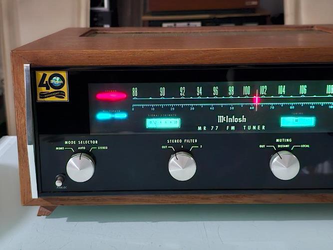 McINTOSH MR-77 เป็นหนึ่งใน Stereo FM/AM Tuner ที่รับคลื่นวิทยุ FM ได้ดีที่สุดในโลก โดดเด่นด้วยระบบ FM Multiplex ด้วยสรรพเสียงยอดเยี่ยมใกล้เคียงกับการฟังจากแผ่น CD เลยทีเดียว จอ Display ขนาดใหญ่ แสดงสถานีวิทยุ และฟังค์ชั่นการทำงานเป็นสีเขียว สวยงามอลังการเป็นอย่างมาก ตัวเครื่องพร้อมกล่องไม้ มีขนาดใหญ่ และหนักพอสมควร กว้าง 44 สูง 19 ลึก 38 ซม. น้ำหนักประมาณ 15 กก.
