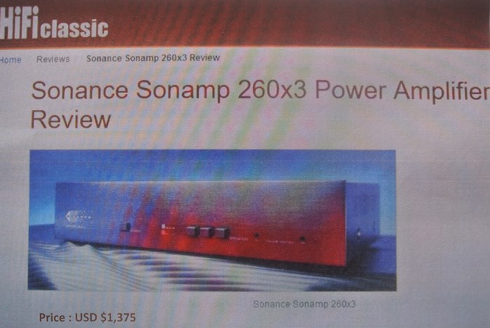 2. SONANCE Sonamp 260X3 Stereo Power Amplifier สามารถต่อลำโพงได้มากถึง 3 คู่ ด้วยพลังเสียงได้สูงสุดถึง 100 วัตต์ต่อข้าง ภายในตัวเครื่องติดตั้งแต่ชิ้นส่วน อุปกรณ์ วัสุด และวงจรที่คัดสรรมาแต่ระดับ Audio Grade รวมทั้งหม้อแปลง Toroidal ขนาดใหญ่ / Capacitor กรองไฟ 30,000 uF(15,000uF+15,000uF) ตัวเครื่องกว้าง 49 สูง 11 ลึก 33 ซม. น้ำหนักประมาณ 10 กก.