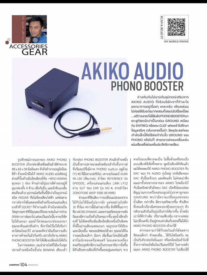 Akiko ได้พัฒนา Phono Booster ซึ่งเป็นอุปกรณ์ที่ช่วยลดสัญญาณรบกวนที่เป็นความถี่สูงได้อย่างมีประสิทธิภาพเพื่อให้เสียงที่ได้เป็นไปตามธรรมชาติและสะอาดขึ้น ทำให้คุณสามารถรื่นรมย์กับแผ่นเสียงที่เก็บสะสมได้อย่างเต็มประสิทธิภาพ