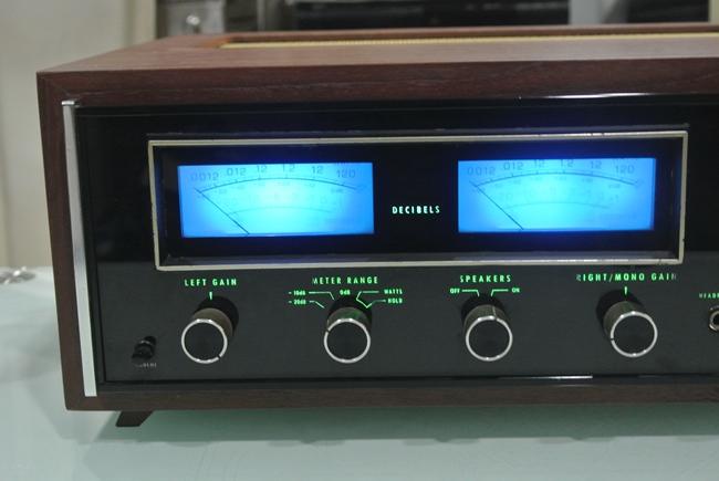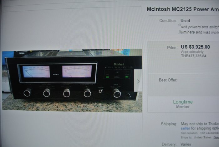 McINTOSCH MC-2125 ผลิต USA ใช้ไฟ 220V ตัวเครื่อง และกล่องไม้ยังอยู่ในสภาพสมบูรณ์ ไฟทุกดวงยังติดสว่าง เข็ม VU Meter ยังกระดิกเท่ากันทั้ง 2 ช่อง ปุ่มควบคุมการทำงานทั้งหมด ยังใช้ได้เป็นปกติ