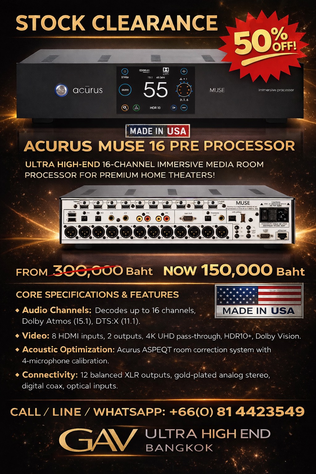 ลดล้างสต็อค 50% ปรีโปรเซสเซอร์ ระดับไฮเอ็นด์ ACURUS รุ่น MUSE 16 , Discrete 16 แชลแนล รองรับ 9.1.6 Dolby Atmos เป็นสินค้าใหม่ยังไม่แกะกล่อง จัดราคาพิเศษ จากราคาปรกติ ตัวละ 300,000 บาท เหลือ 150,000 บาท ต่อตัว มีจำนวนจำกัด มาก่อน จ่ายก่อน ได้ไปเล่นก่อน ครับ