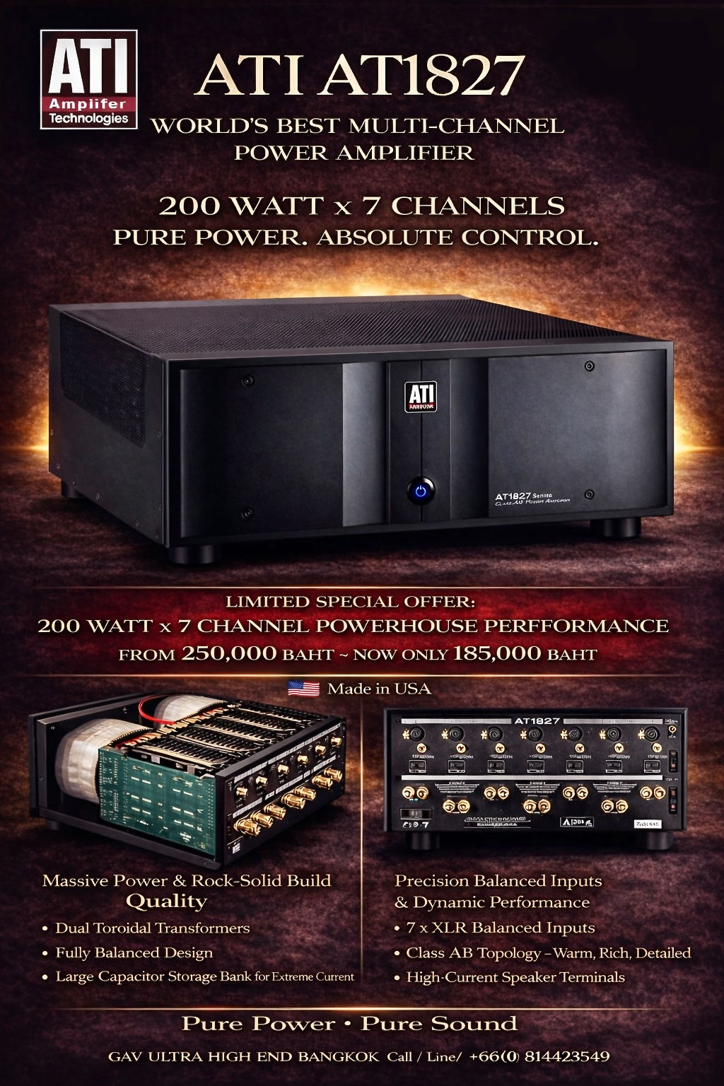 จะหาที่เสียงดีกว่านี้ ไม่มีแล้วครับ !!! ATI แอมป์มัลติแชลแนล รุุ่น AT1827 แอมป์คลาส AB ให้เสียงที่ดีกว่าทุกยี่ห้อมากมายและเหนือกว่าแอมป์คลาส D ในทุกมิติครับ จัดโปรฯ สินค้าแอมป์ ATI ล็อตใหม่พร้อมจัดส่งในราคาลดพิเศษ จากปรกติ 250,000 บาท เหลือ 185,000 บาท รับประกัน 3 ปี (Non Transfered ) แอมป์มัลติแชลแนล ATI รุ่น AT 1827 แอมป์มัลติแชลแนลอันดับหนึ่ง สุดคุ้มทั้งประสิทธิภาพ และ กำลังขับเหลือๆ 200 วัตต์ต่อแชลแนลที่ 8 โอมห์ CLASS AB ,FULLY BALANCE, MADE IN USA ดีกว่านี้ ไม่มีแล้วครับ