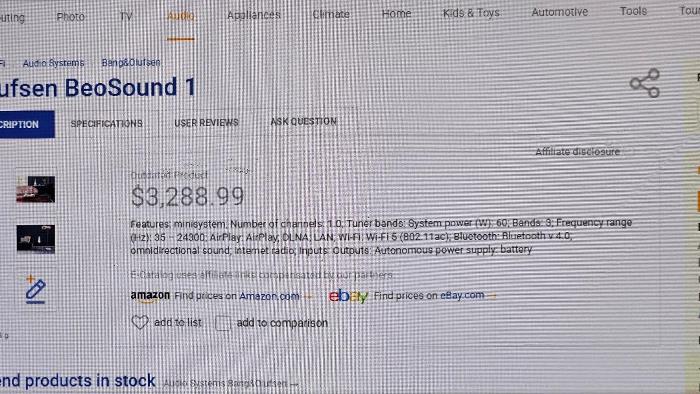 1. Bang & Olufsen Beosound 1 เครื่องเสียงรวมชิ้น All in One Music Center ระดับ Hi-End ดีไซน์สวยล้ำนำสมัยในระดับ State of The Art ใช้งานได้อย่างหลากหลายทั้งฟังเพลงจาก Audiophile CD วิทยุ Tuner FM 88-108MHz ตั้งสถานีวิทยุได้มากถึง 59 สถานี นาฬิกาบอกเวลา ตั้งเวลาปลุกได้ ให้ Sound-Stage อันยอดเยี่ยมจากลำโพง 3 ทาง 5 ดอก เสียงแหลม Soft dome tweeter ขนาด 1.5 นิ้ว 2 ดอก และเสียงกลาง Midrange ขนาด 5 นิ้ว 2 ดอก ลำโพงเสียงทุ้ม Subwoofer ขนาด 8 นิ้ว 1 ดอก ตัวเครื่องมีขนาดใหญ่ และหนักพอสมควร กว้าง 51 สูง 34 ลึก 16 ซม. น้ำหนักประมาณ 7 กก. โดยด้านหลังเครื่องตอนบนเหนือช่องใส่ CD จะมีร่องสำหรับยกเครื่องไปมา กสามารถนำพาไปใช้งานตามสถานที่ต่าง ๆ ได้โดยสะดวก เป็นเครื่องเสียงที่เหมาะสำหรับเป็นของตกแต่งบ้าน ร้านค้า หรือสำนักงานที่สวยงาม โดดเด่น ล้ำสมัยเป็นอย่างมาก ที่ให้เสียงเพลงอันยอดเยี่ยมได้อีกด้วย