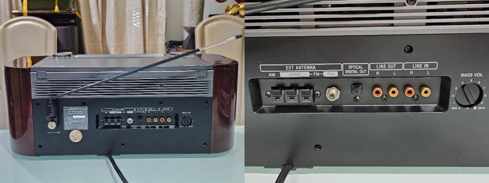 - Connections: AUX 1, FM aerial/75 ohm 1, Headphone / Mini-jack 1, Mains 1