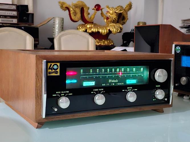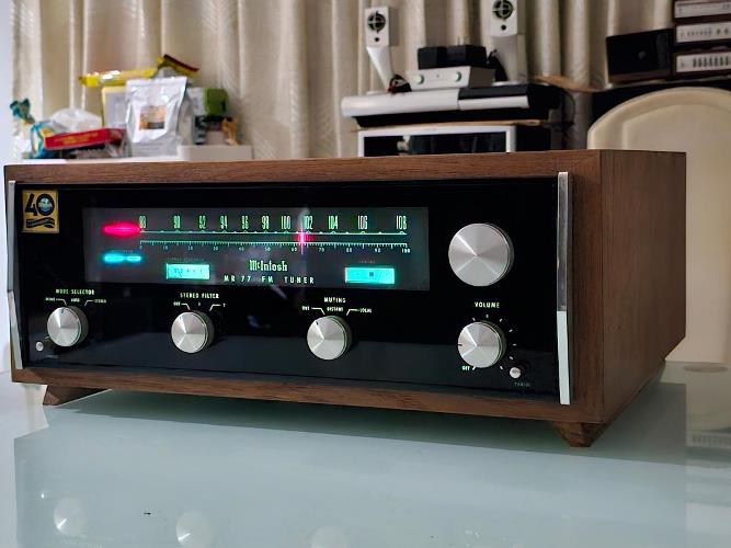 McINTOSH MR-77 เป็นหนึ่งใน Stereo FM/AM Tuner ที่รับคลื่นวิทยุ FM ได้ดีที่สุดในโลก โดดเด่นด้วยระบบ FM Multiplex ด้วยสรรพเสียงยอดเยี่ยมใกล้เคียงกับการฟังจากแผ่น CD เลยทีเดียว จอ Display ขนาดใหญ่ แสดงสถานีวิทยุ และฟังค์ชั่นการทำงานเป็นสีเขียว สวยงามอลังการเป็นอย่างมาก ตัวเครื่องพร้อมกล่องไม้ มีขนาดใหญ่ และหนักพอสมควร กว้าง 44 สูง 19 ลึก 38 ซม. น้ำหนักประมาณ 15 กก.
