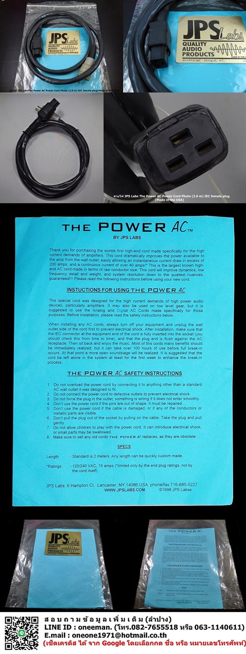 ของคุณและถอดปลั๊กผนังด้านนอกของสายก่อนเสมอเพื่อป้องกันการช็อตไฟฟ้า หลังจากการติดตั้ง ตรวจสอบให้แน่ใจว่าตัวเชื่อมต่อIEC ที่ปลายสายอุปกรณ์ถูกแทรกอย่างเต็มที่ในซ็อกเก็ตที่คุณควรตรวจสอบนี้เป็นครั้งคราว) และปลายปลั๊กถูกกดกับช่องรับ AC จากนั้นนั่งเฉย ๆ และเพลิดเพลินกับเพลง ส่วนใหญ่ของสายเหล่านี้ ประโยชน์มากมายควรจะเกิดขึ้นทันที แต่มันอาจใช้เวลามากกว่า 100 ชั่วโมง oงดก่อนที่จะเกิดการบุกรุกแบบเต็มรูปแบบ ณ จุดนั้นจะมีขั้นตอนเสียงที่เปิดกว้างมากขึ้นที่จะเกิดขึ้น แนะนำให้ทิ้งสายไฟ ไว้ในระบบอย่างน้อยสัปดาห์แรกเพื่อเพิ่มขั้นตอนการบุกรุกตามคำแนะนำด้านความปลอดภัย POWER AC 1อย่าใช้สายไฟมากเกินไป โดยเชื่อมต่อกับสิ่งอื่นนอกเหนือจากช่องรับส่งผนัง AC มาตรฐานที่ออกแบบมาให้พอดี 2 อย่าเชื่อมต่อสายไฟกับอุปกรณ์ภายนอกที่บกพร่อง เพื่อป้องกันการช็อตไฟฟ้า 3 อย่าบังคับปลั๊กในช่องรับส่ง: มีบางอย่างผิดปกติถ้ามันไม่เข้าอย่างราบรื่น 4 อย่าใช้สายไฟหากเข็มหมุดไม่มีรูปร่าง ต้องซ่อมมันให้ได้ 5อย่าใช้สายไฟหากสายเคเบิลเสียหาย หรือหากมีตัวนำหรือชิ้นส่วนโลหะใด ๆ ที่มองเห็นได้ 6อย่าดึงปลั๊กออกจากซ็อกเก็ต โดยการดึงสายเคเบิล ใช้ปลั๊กและดึงเบา ๆ 7 อย่าปล่อยให้เด็กเล่นกับสายไฟ มันสามารถทำให้เกิดไฟฟ้าช็อตได้ หรือส่วนเล็ก ๆ อาจกลืนได้ 8 ตรวจสอบให้แน่ใจว่าจะขายสายไฟเก่าใด ๆ ที่ POWER AC แทนที่ เนื่องจากมีความยาวสเปคที่ล้าสมัย - มาตรฐานคือ 2 เมตร ความยาวใด ๆ ก็สามารถกำหนดได้อย่างรวดเร็ว "เรตติ้ง - 120/240 VAC, 15 แอมป์ ("จำกัดเฉพาะเรตติ้งปลั๊กปลาย ไม่ใช่ขายตามสาย) เจพีเอส แล็บส์