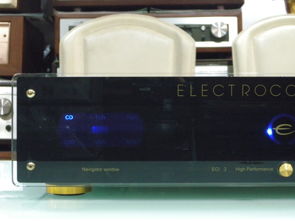 ไม่เพียงเท่านั้น ยังมีปุ่มควบคุมการทำงานเป็นสีทองสวยงามหรูหรามากเพียง 5 ปุ่มเท่านั้น โดดเด่นด้วยแสงไฟสีฟ้าแสดงระดับความดังของเสียง เลื่อนขึ้นลงเป็นวงกลมรอบสัญญลักษณ์ ELECTROCOMPANIET พร้อมด้วย Navigator Window เลือกฟังค์ชั่นแหล่งเสียงที่ต่อเชื่อมเป็นตัวอักษรสีฟ้าเช่นเดียวกัน