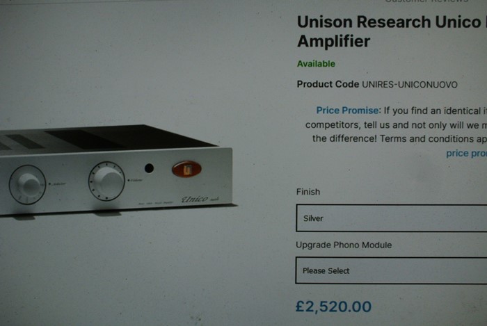 ราคาขายเฉพาะ Unison Research Unico Amplifier เพียงเครื่องเดียวในอังกฤษ GBP £2,520.00 หรือ 115,000 บาท ยังไม่รวมภาษีฯ และค่าขนส่งอีกประมาณ 5,000 บาท