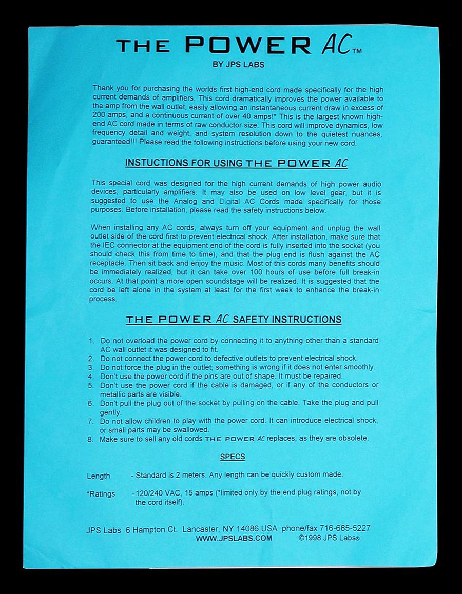 ของคุณและถอดปลั๊กผนังด้านนอกของสายก่อนเสมอเพื่อป้องกันการช็อตไฟฟ้า หลังจากการติดตั้ง ตรวจสอบให้แน่ใจว่าตัวเชื่อมต่อIEC ที่ปลายสายอุปกรณ์ถูกแทรกอย่างเต็มที่ในซ็อกเก็ตที่คุณควรตรวจสอบนี้เป็นครั้งคราว) และปลายปลั๊กถูกกดกับช่องรับ AC จากนั้นนั่งเฉย ๆ และเพลิดเพลินกับเพลง ส่วนใหญ่ของสายเหล่านี้ ประโยชน์มากมายควรจะเกิดขึ้นทันที แต่มันอาจใช้เวลามากกว่า 100 ชั่วโมง oงดก่อนที่จะเกิดการบุกรุกแบบเต็มรูปแบบ ณ จุดนั้นจะมีขั้นตอนเสียงที่เปิดกว้างมากขึ้นที่จะเกิดขึ้น แนะนำให้ทิ้งสายไฟ ไว้ในระบบอย่างน้อยสัปดาห์แรกเพื่อเพิ่มขั้นตอนการบุกรุกตามคำแนะนำด้านความปลอดภัย POWER AC 1อย่าใช้สายไฟมากเกินไป โดยเชื่อมต่อกับสิ่งอื่นนอกเหนือจากช่องรับส่งผนัง AC มาตรฐานที่ออกแบบมาให้พอดี 2 อย่าเชื่อมต่อสายไฟกับอุปกรณ์ภายนอกที่บกพร่อง เพื่อป้องกันการช็อตไฟฟ้า 3 อย่าบังคับปลั๊กในช่องรับส่ง: มีบางอย่างผิดปกติถ้ามันไม่เข้าอย่างราบรื่น 4 อย่าใช้สายไฟหากเข็มหมุดไม่มีรูปร่าง ต้องซ่อมมันให้ได้ 5อย่าใช้สายไฟหากสายเคเบิลเสียหาย หรือหากมีตัวนำหรือชิ้นส่วนโลหะใด ๆ ที่มองเห็นได้ 6อย่าดึงปลั๊กออกจากซ็อกเก็ต โดยการดึงสายเคเบิล ใช้ปลั๊กและดึงเบา ๆ 7 อย่าปล่อยให้เด็กเล่นกับสายไฟ มันสามารถทำให้เกิดไฟฟ้าช็อตได้ หรือส่วนเล็ก ๆ อาจกลืนได้ 8 ตรวจสอบให้แน่ใจว่าจะขายสายไฟเก่าใด ๆ ที่ POWER AC แทนที่ เนื่องจากมีความยาวสเปคที่ล้าสมัย - มาตรฐานคือ 2 เมตร ความยาวใด ๆ ก็สามารถกำหนดได้อย่างรวดเร็ว "เรตติ้ง - 120/240 VAC, 15 แอมป์ ("จำกัดเฉพาะเรตติ้งปลั๊กปลาย ไม่ใช่ขายตามสาย) เจพีเอส แล็บส์