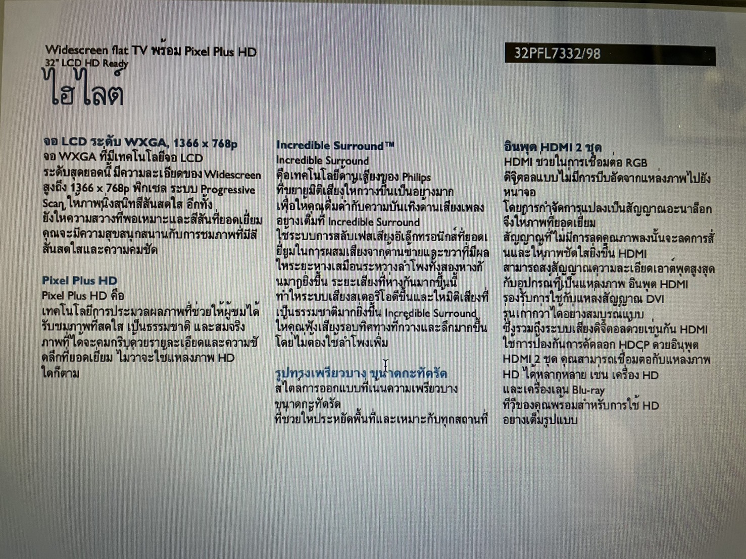 สุดยอดจอ PHILIPS 32" WIDE SCREEN FLAT SCREEN TV จอแบน ภาพ Pixel Plus HD 1080p, 24, 50, 60Hz สเปคสูง + รีโมท สภาพเดิมสวยมากเหมือนใหม่ มือเดียวจากห้าง ใช้น้อยมาก ไม่เคยเสีย-ซ่อม ใช้งานเหมือนใหม่ 1ใน100 ตัวเครื่องหนักมาก ไม่เบาเหมือนรุ่นใหม่ ออกใหม่หมื่นกว่า เจ้าของส่งมาขายหน้าร้านถูกที่สุดเพียง 2500.-เท่านั้น