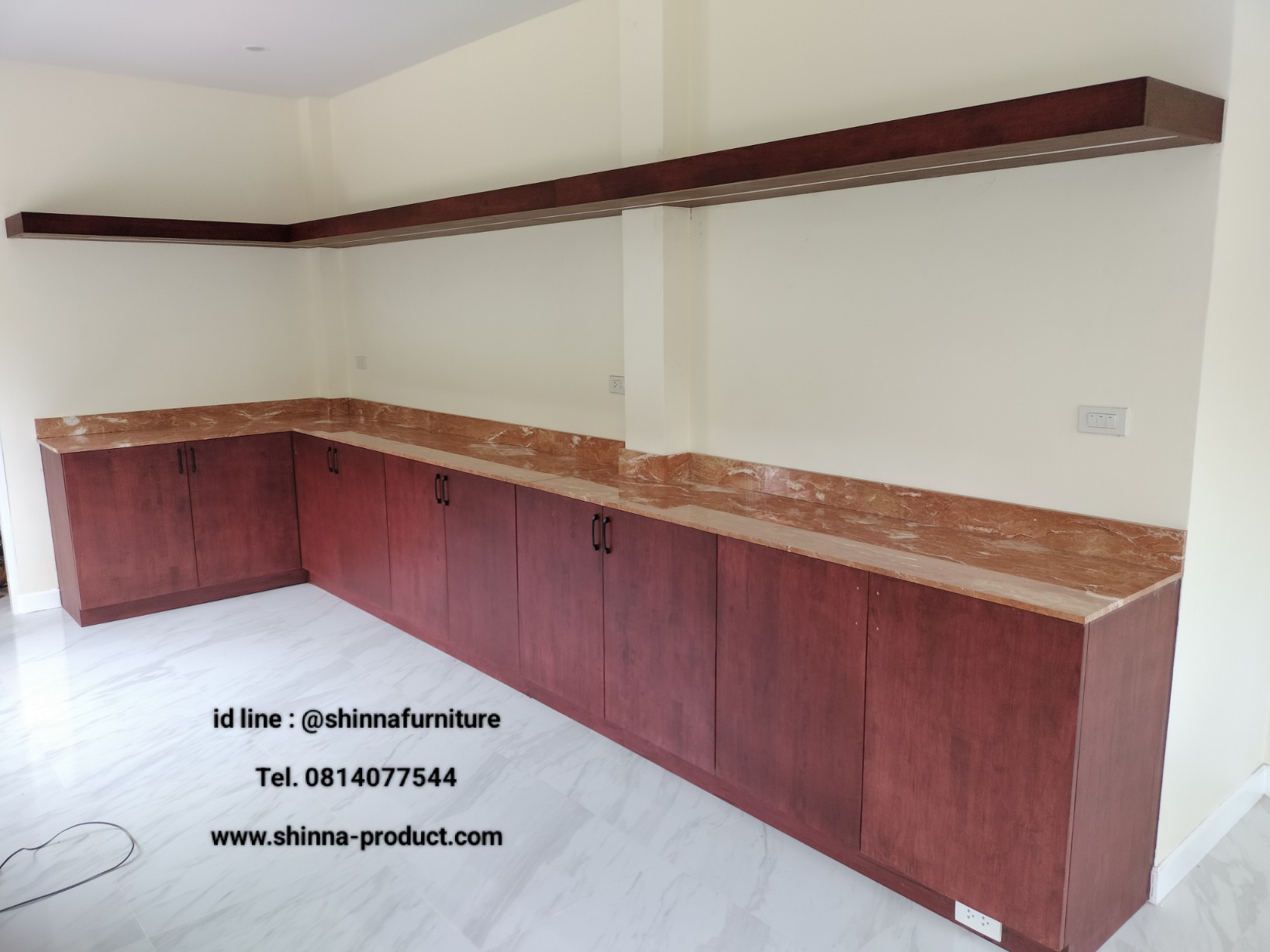 2. โซนด้านหน้าห้อง ลูกค้าต้องการใช้พื้นที่ส่วนนี้ในการนั่งเล่นและต้อนรับแขก สั่งทำเคาร์เตอร์+ แผ่น top หินอ่อน และชั้นลอยติดผนัง+ชุดไฟ Led ใต้ชั้นลอย ทั้งหมดใช้ไม้ยางพาราประสาน(ไม้จริง)+ย่อมสีไม้แดง