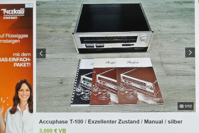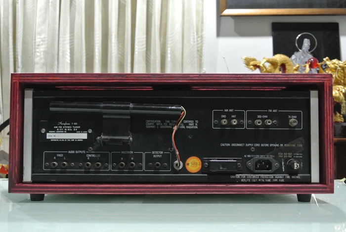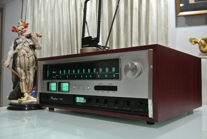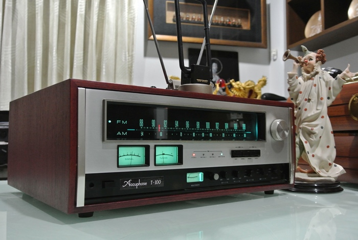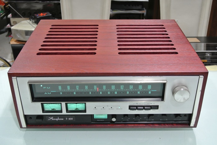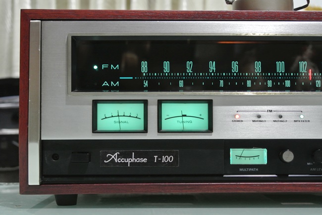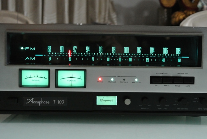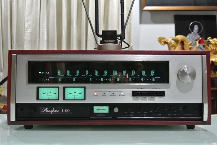 2. ACCUPHASE T-100 Stereo FM/AM Tuner รุ่นใหญ่สุดระดับ Hi-End ที่ให้คุณภาพเสียงคมชัดมากในระดับที่ใกล้เคียงกับ CD เลยทีเดียว สามารถรับคลื่นวิทยุบ้านเราตั้งแต่ 88 – 108 MHz ได้อย่างคมชัดทุกสถานี ติดตั้งจอเข็ม VU Meter ไฟสีเขียวอ่อนขนาดใหญ่มากถึง 3 ช่อง ตัวเครื่องสีทองแชมเปญสวยงาม หรูหรา หุ้มรอบตัวเครื่องด้วยไม้ธรรมชาติเซาะร่องระบายความร้อนด้านบนเอกลักษณ์ดีไซน์ของ ACCUPHASE โดยเฉพาะ ตัวเครื่องมีขนาดใหญ่ และหนักที่สุดในบรรดา Tuner ด้วยกัน กว้าง 45 สูง 16 ลึก 36 ซม. น้ำหนักประมาณ 15 กก.