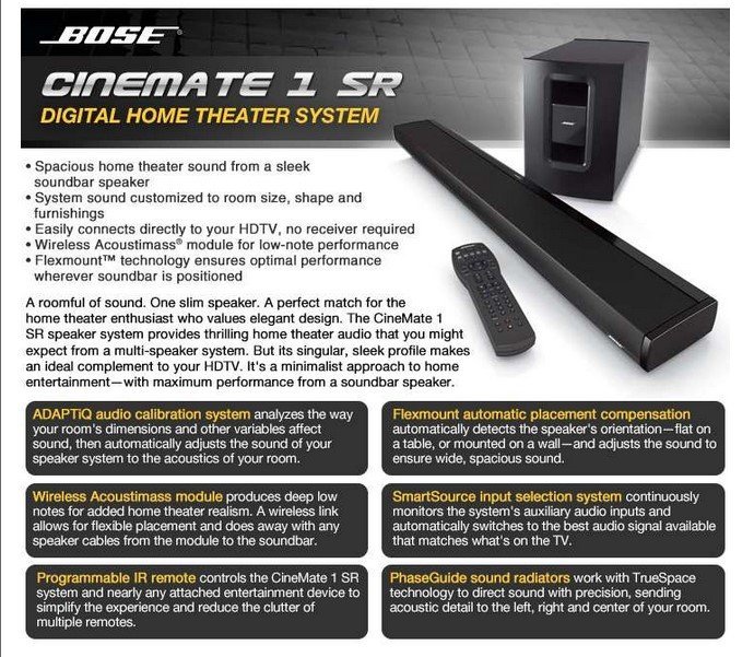 BOSE CINEMATE 1SR สุดยอด SOUNDBAR HI ENDแท้รุ่นใหญ่สุดจาก BOSE เดิมๆจากโรงงาน เครื่องสเปคบ้านเรา ไฟ 220v อุปกรณ์ครบทุกชิ้น ดูหนัง + ฟังเพลงสุดยอด 5ดาวระดับโลกแท้ ใช้งานเหมือนใหม่ ออกใหม่บ้านเรา 79000.-ลด 61100.-ส่งมาฝากขายหน้าร้านถูกๆเพียง 19900.-เท่านั้น