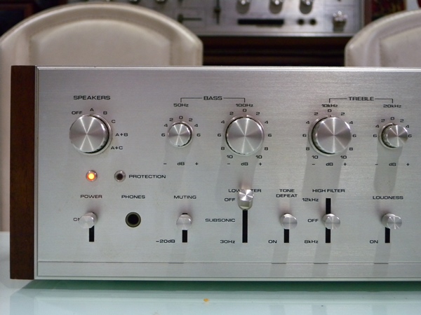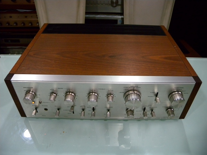 2. PIONEER SA-910 Integrated Amplifier รุ่นใหญ่สุด ที่นอกจะโดดเด่นด้วยตัวอักษร ตัวเลข และสัญญลักษณ์ต่าง ๆ เป็นแบบปั๊มจมลงบนโลหะตัวเครื่องด้านหน้า ที่จะมีความทนทานคงอยู่อย่างคมชัด ไม่มีการหลุด ลอก จางหายตลอดกาลแล้ว ยังให้พลังเสียงมากถึง 100 วัตต์ต่อข้าง สามารถต่อเชื่อมกับลำโพงได้มากถึง 3 คู่ รวมทั้งแหล่งเสียงหลัก ๆ ได้อย่างครบครันทั้ง Tuner, CD, Phono 1/2, Tape 1/2, Aux 1/2 พร้อมช่อง Pre Out สำหรับต่อเชื่อมกับ Power Amplifier เพื่อทำหน้าที่เป็น Preamplifier ได้อย่างยอดเยี่ยม มีปุ่ม Loudness เพื่อมิติเสียงที่ดีกว่าอีกระดับหนึ่งให้เลือกใช้อีกด้วย ด้านหลังตัวเครื่องยังมีปุ่ม Lavel Control สำหรับ Aux, Phono, Speaker โดยเฉพาะ Phono 2 มีให้เลือกใช้ได้ทั้ง 25K, 50K, 100K จึงไม่ต้องสงสัยเลยว่า ภาค Phono ให้คุณภาพ และมิติเสียงที่สุดยอดเพียงใด ตัวเครื่องมีขนาดใหญ่ และหนักมาก โดยกว้าง 43 สูง 14 ลึก 35 ซม. น้ำหนักประมาณ 15 กก.