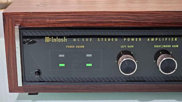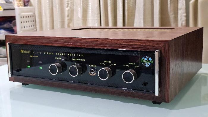 McINTOSH MC-502 Stereo Power Amplifier ระดับ Hi-End สำหรับนักฟังเพลงงบน้อยโดยเฉพาะ ด้วยพลังเสียง 75 วัตต์ต่อข้าง ที่สำคัญยังติดตั้งปุ่มปรับระดับความดังเสียงของลำโพงทั้งซ้าย-ขวาบนด้านหน้าตัวเครื่อง ทำให้สามารถนำเครื่องเล่น CD, Tuner, Tape, Streaming เครื่องเล่นแผ่นเสียงมาต่อตรงได้ โดยไม่ต้องผ่าน Preamplifier แต่อย่างใด ด้วยสรรพเสียงยอดเยี่ยมมาก ตัวเครื่องรวมกล่องไม้ธรรมชาติมีขนาดใหญ่ และหนักพอสมควร โดยกว้าง 45 สูง 14 ลึก 40 ซม. น้ำหนักประมาณ 15 กก.