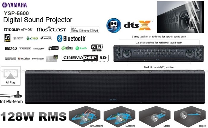 Yamaha อ้างว่า YSP-5600 ให้เอฟเฟกต์เดียวกับระบบ 7.1.2 นั่นคือลำโพงเซอร์ราวด์ 7 ตัว พร้อมซับวูฟเฟอร์ 1 ตัว และลำโพงแบบยิงเสียงขึ้นด้านบนอีก 2 ตัว ทั้งหมดนี้มาจากบาร์เดียว ถือเป็นคำกล่าวอ้างที่กล้าหาญจริงๆ