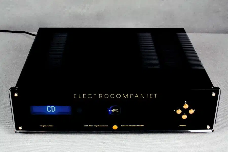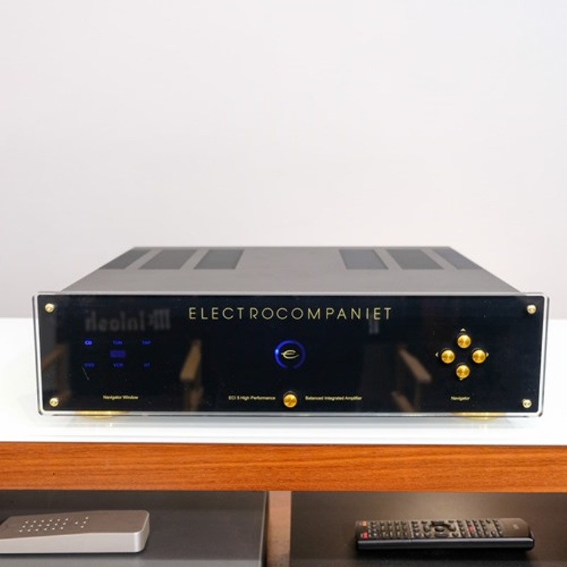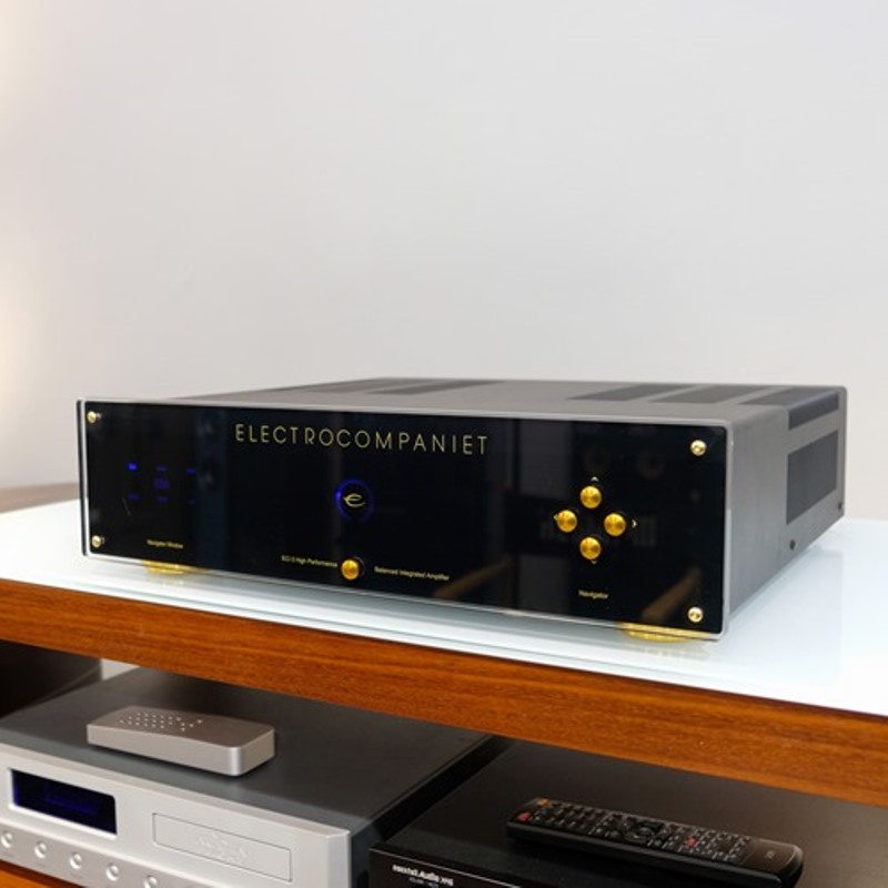 2. เข้าคู่ด้วย ELECTROCOMPANIET ECI-5 Mk II Stereo Integrated Amplifier รุ่นใหญ่ระดับ Hi-End ชั้นนำของโลกจาก Norway ผลงาน Masterpiece ที่มีความสวยงามระดับ State of The Art ที่โดดเด่นทางด้านคุณภาพเสียงอันนุ่ม เนียน หวาน กระจ่างใสอย่างไม่เป็นสองรองใคร ที่สำคัญตัวเครื่องด้านหน้ายังมีการติดตั้งแผ่นกระจกหนา 50 มิลลิเมตรประกบเข้าไปได้อย่างปราณีตสวยงามมาก จนได้รับการยกย่องจากนักวิจารณ์เครื่องเสียงทั่วโลก ให้เป็น McINTOSH แห่งยุโรป ไม่เพียงเท่านั้น ยังมีปุ่มควบคุมการทำงานเป็นสีทองสวยงามหรูหรามากเพียง 5 ปุ่มเท่านั้น โดดเด่นด้วยแสงไฟสีฟ้าแสดงระดับความดังของเสียง เลื่อนขึ้นลงเป็นวงกลมรอบสัญญลักษณ์ ELECTROCOMPANIET พร้อมด้วย Navigator Window เลือกฟังค์ชั่นแหล่งเสียงที่ต่อเชื่อมเป็นตัวอักษรสีฟ้าเช่นเดียวกัน ให้พลังเสียงได้สูงสุดถึง 200 วัตต์ต่อข้าง สามารถต่อเชื่อมกับแหล่งเสียงหลัก ๆ ได้ทั้ง Tuner, CD, Tape, Aux ตัวเครื่องมีขนาดใหญ่โตกว่าเครื่องเสียงทั่วไปเป็นอย่างมาก กว้าง 49 สูง 14 ลึก 41 ซม. น้ำหนักประมาณ 20 กก.