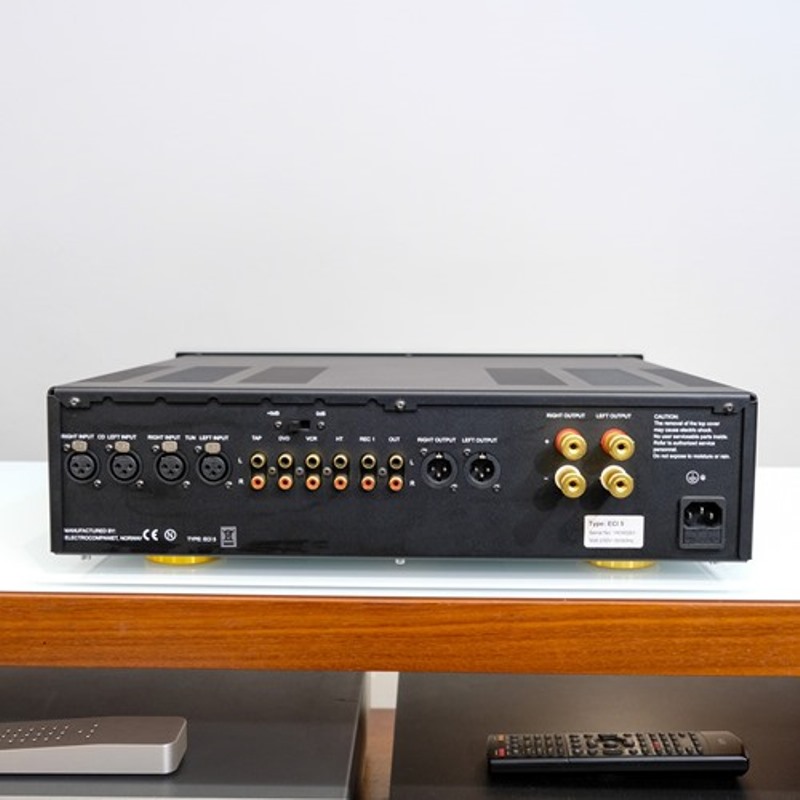 ELECTROCOMPANIET ECI-5 Mk II ผลงานการผลิตในประเทศนอรเวย์ หนึ่งในประเทศที่ได้รับการยกย่องว่า ผลิตลำโพง และเครื่องเสียงคุณภาพดีที่สุดในโลก ใช้ไฟ 220 V ด้านหลังตัวเครื่องมีการติดตั้งช่องต่อสายไฟแบบ IEC เพื่อเพิ่มทางเลือกไปใช้สายไฟฟ้า AC Power cord ที่ดีกว่าสายไฟฟ้าแบบธรรมดาที่ติดมากับตัวเครื่อง อันจะได้มาซึ่งประสิทธิผลที่เหนือกว่าได้ ที่สำคัญยังมีช่องต่อเชื่อมสัญญาณแบบ Balance(XLR) อีกระดับคุณภาพเสียงที่เหนือกว่า RCA ทั่วไปมากถึง 3 ชุด พร้อมช่อง Pre Out สำหรับต่อเชี่อมกับ Power Amplifier เพื่อทำหน้าที่เป็น Preamplifier ได้อย่างยอดเยี่ยม ซึ่งสิ่งเหล่านี้จะมีอยู่แต่ในเครื่องเสียงตัวเครื่องระดับ Hi-End ราคาแพงสุดโต่งเท่านั้น สภาพตัวเครื่องยังสวยงามมาก เหมือนอย่างกับเป็นของใหม่ที่เพิ่งแกะออกมาจากกล่อง มี Remote Control ตรงรุ่น คู่มือใช้งาน และกล่องบรรจุของแท้ให้ครบ