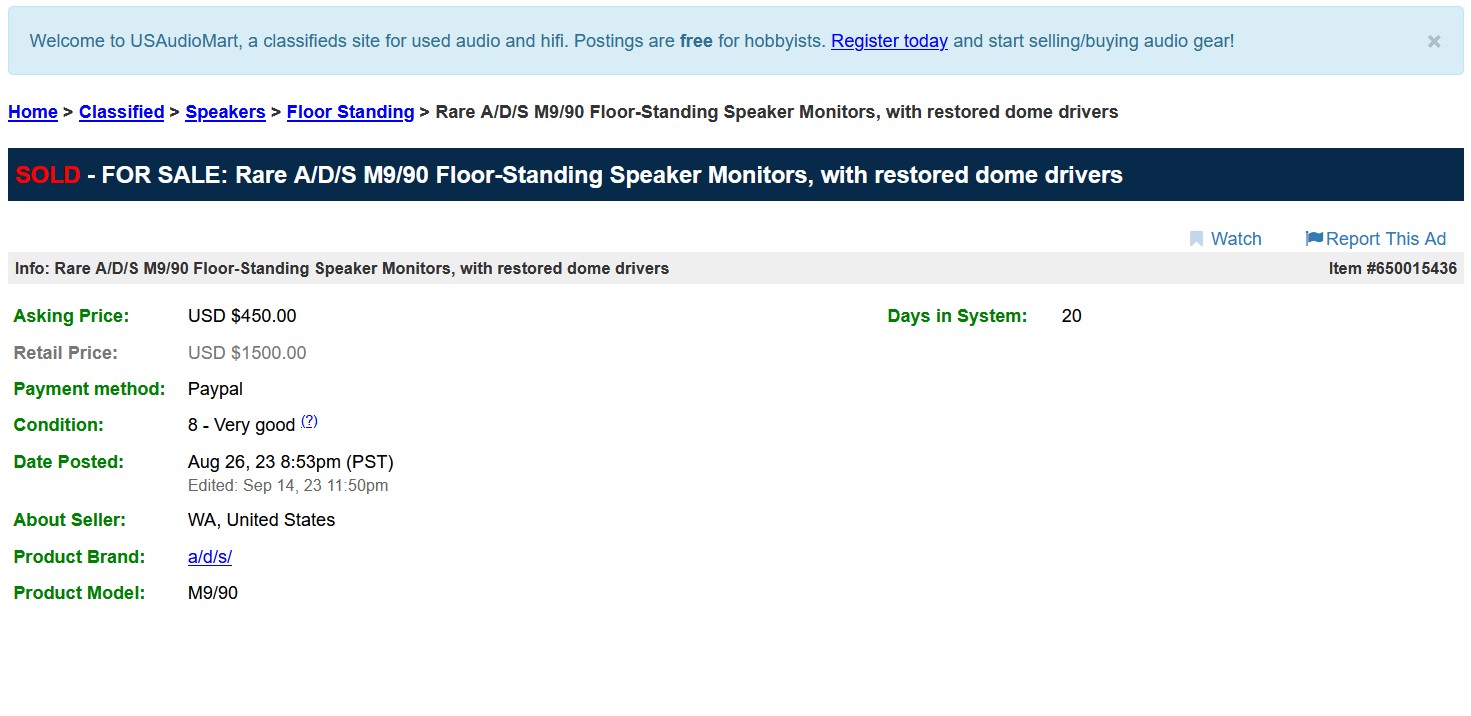 A D S M9 MADE IN USA สุดยอดลำโพงฟังเพลงตั้งพื้นรุ่นใหญ่ SERIES 9 ชนิด 3ทาง DRIVER 8"งานUSAแท้ + BODYไม้แท้หนักมาก สภาพเดิมสวยมาก ฟังเพลงเสียงดีสุดยอดระดับ 5ดาว ใช้งานเหมือนใหม่ เสียงดีเหมือนตอนออก ออกใหม่ 1500 USDบ้านเรา 50000.-กว่า เจ้าของยกมาขายหน้าร้านถูกๆเพียงคู่ละ 16900.-เท่านั้น