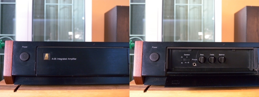 AR A-05 Stereo Integrated Amplifier ดีไซน์สุดสวย แสนคลาสสิคด้วยตัวเครื่องสีดำ มีการยกตัวเครื่องด้านหน้าให้เชิดขึ้นเล็กน้อย เข้าด้านข้างด้วยไม้ธรรมชาติสี Walnut ลวดลายสวยงาม ด้านหน้าซ้ายเป็น 2 ชั้นมีบานพับเปิด-ปิดได้ เพื่อเก็บซ่อนปุ่มควบคุมการทำงานไว้ภายใน ให้พลังเสียงได้สูงสุดถึง 100 วัตต์ต่อข้าง ต่อเชื่อมลำโพงได้ 2 คู่ พร้อมแหล่งเสียงหลัก ๆ ได้อย่างครบครันทั้ง Tuner, CD, Phono MM/MC, Tape 1/2 ตัวเครื่องกว้าง 47 สูง 10 ลึก 35 ซม. น้ำหนักประมาณ 10 กก.