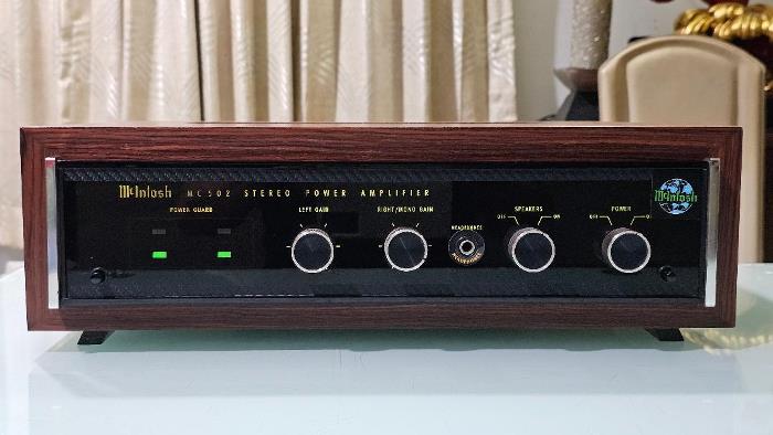 McINTOSH MC-502 Stereo Power Amplifier ระดับ Hi-End สำหรับนักฟังเพลงงบน้อยโดยเฉพาะ ด้วยพลังเสียง 75 วัตต์ต่อข้าง ที่สำคัญยังติดตั้งปุ่มปรับระดับความดังเสียงของลำโพงทั้งซ้าย-ขวาบนด้านหน้าตัวเครื่อง ทำให้สามารถนำเครื่องเล่น CD, Tuner, Tape, Streaming เครื่องเล่นแผ่นเสียงมาต่อตรงได้ โดยไม่ต้องผ่าน Preamplifier แต่อย่างใด ด้วยสรรพเสียงยอดเยี่ยมมาก ตัวเครื่องรวมกล่องไม้ธรรมชาติมีขนาดใหญ่ และหนักพอสมควร โดยกว้าง 45 สูง 14 ลึก 40 ซม. น้ำหนักประมาณ 15 กก.