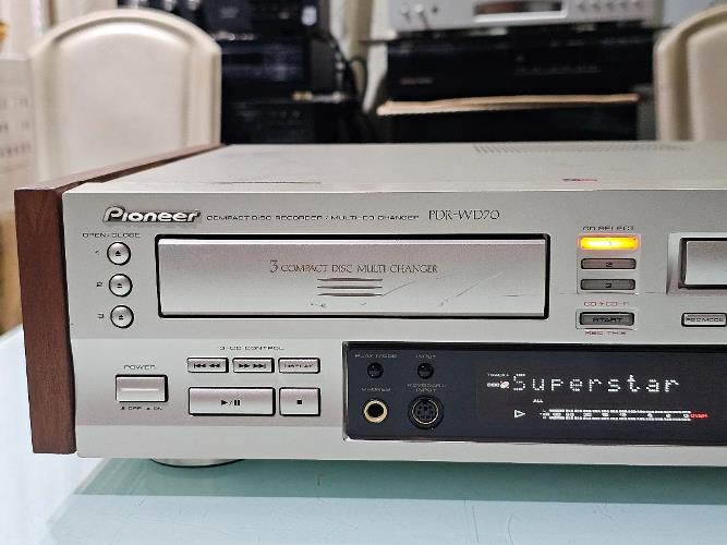 PIONEER PDR-WD70 เครื่องเล่น 3 Audiophile CD Player + CD Recorder รุ่นพิเศษในระดับ Monitor Reference ที่นอกจากจะสามารถเล่น Audiophile CD ได้ 3 แผ่นแล้ว ยังสามารถบันทึกเสียงจากแผ่น Audiophile CD ชื่นชอบมาลงแผ่น Blank Audiophile CD ได้อย่างยอดเยี่ยมอีกด้วย โดดเด่นกว่า CD Player ทั่วไป ด้วยสุดยอดวงจร 1-BIT-DLC ตัวเครื่องสีทองหรูหรามากคุณค่า มีขนาดใหญ่กว่าเครื่องเล่น CD Player ทั่วไป กว้าง 46 สูง 13 ลึก 37 ซม.น้ำหนักประมาณ 7 กก.