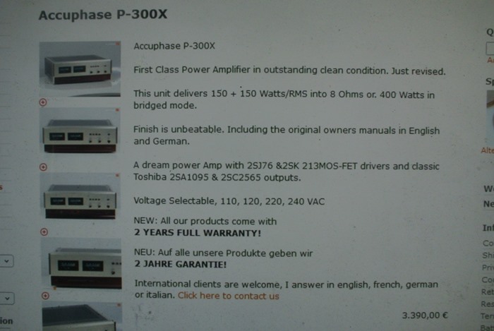 ACCUPHASE P-300X ผลิต Japan ใช้ไฟ 220V สายไฟฟ้าที่ติดมากับตัวเครื่องมีขนาดใหญ่มาก เพื่อให้สามารถเป็นสื่อนำกำลังไฟฟ้าเข้าตัวเครื่องได้อย่างมีประสิทธิภาพ เช่นเดียวกับสายไฟฟ้า AC Power Cord ราคาแพงเลยทีเดียว ตัวเครื่อง และกล่องไม้ธรรมชาติยังอยู่ในสภาพที่สวยงามมาก จอ VU Meter ยังติด และเข็มยังกระดิกเป็นปกติทั้ง 2 ข้าง ปุ่มควบคุมการทำงานทั้งหมดยังใช้งานได้เป็นปกติอย่างมีประสิทธิภาพ