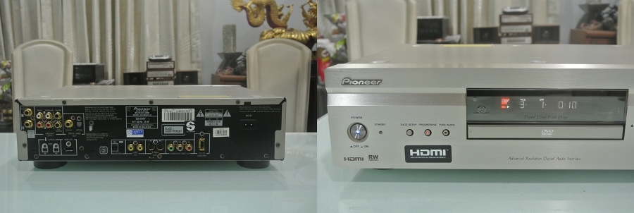 PIONEER DV-989AVi เครื่องเล่น Universal DVD/SACD/CD Player ระดับ Hi-End รุ่นใหญ่สุด Top of The Line ในตระกูล DV Series รองรับได้ทั้งความบันเทิงในการชมภาพยนตร์จากแผ่น DVD ทุกฟอร์แมท ไม่ว่าจะเป็น DVD-Video / DVD-Audio/S-VCD/compact disk / Video CD / DVD-R / DVD-RW (video mode) / MP3/Joint Photographic Expert Group และให้ความเพลิดเพลินในการฟังเพลงจากแผ่น CD ทุกฟอร์แมททั้ง Master, Copy, Write ได้อย่างรวดเร็วแม่นยำ รวมทั้งสุดยอดแผ่น Super Audio Compact Disc (SACD) อีกระดับคุณภาพเสียงที่เหนือกว่าแผ่น Audiophile CD ทั่วไป ตัวเครื่องผลิตจากทองแดงปลอดสนิมตลอดกาลพ่นทับด้วยสีทองแชมเปญขัดเสี้ยนสวยงาม หรูหรา มีขนาดใหญ่ และหนักพอสมควร กว้าง 44 สูง 12 ลึก 39 ซม. น้ำหนักประมาณ 9 กก.