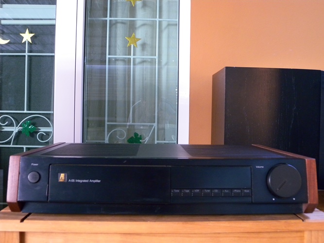 AR A-05 Stereo Integrated Amplifier ดีไซน์สุดสวย แสนคลาสสิคด้วยตัวเครื่องสีดำ มีการยกตัวเครื่องด้านหน้าให้เชิดขึ้นเล็กน้อย เข้าด้านข้างด้วยไม้ธรรมชาติสี Walnut ลวดลายสวยงาม ด้านหน้าซ้ายเป็น 2 ชั้นมีบานพับเปิด-ปิดได้ เพื่อเก็บซ่อนปุ่มควบคุมการทำงานไว้ภายใน ให้พลังเสียงได้สูงสุดถึง 100 วัตต์ต่อข้าง ต่อเชื่อมลำโพงได้ 2 คู่ พร้อมแหล่งเสียงหลัก ๆ ได้อย่างครบครันทั้ง Tuner, CD, Phono MM/MC, Tape 1/2 ตัวเครื่องกว้าง 47 สูง 10 ลึก 35 ซม. น้ำหนักประมาณ 10 กก.