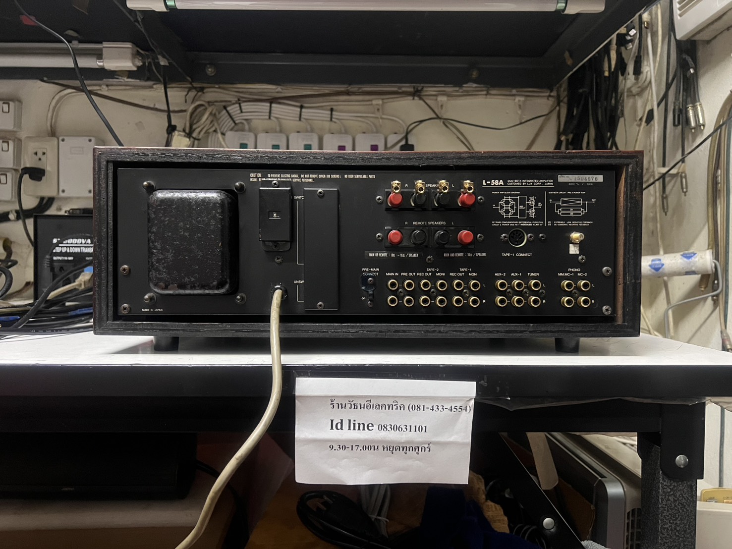 LUXMAN L-58A MADE IN JAPAN เครื่องบ้านเรา ไฟ 220V สภาพเดิมสวยมาก ฟังเพลงเสียงดีสุดยอด 5ดาวระดับโลก รุ่นใหญ่สเปคสูงงาน AUDIO GRADEแท้ทุกชิ้น มาพร้อม PHONOในตัวถึง 2ชุด รองรับทั้ง MM/MC ต่อลำโพงได้มากถึง 2ชุดรองรับระบบเสียง BI WIRE ใช้งานเหมือนใหม่ทุกระบบ เจ้าของส่งมาฝากขายหน้าร้านถูกๆเพียง 22900.-เท่านั้น