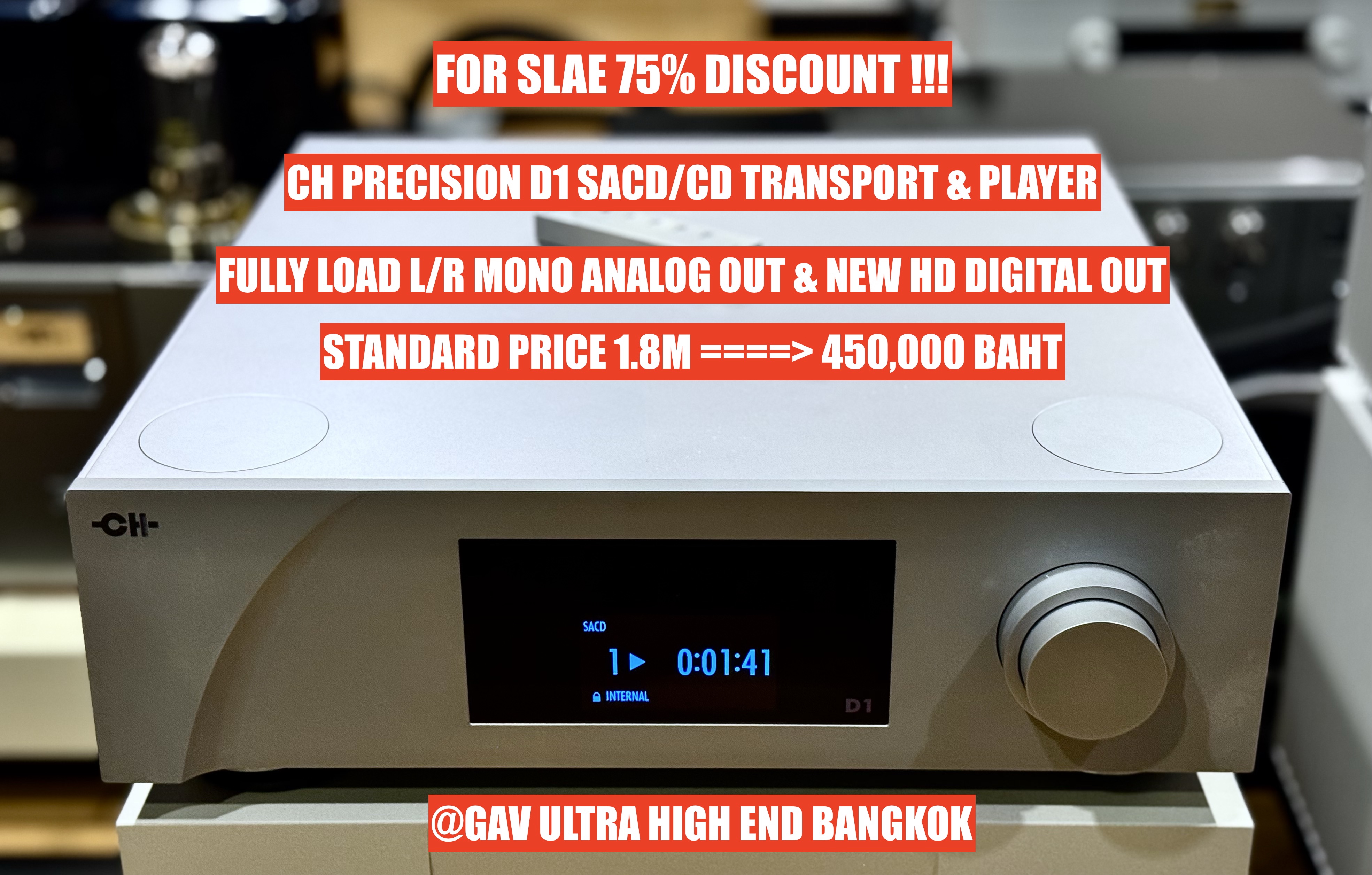 ดี และ ถูกกว่านี้ ไม่มีแล้วครับ SHOCK PRICE ลดกว่า 75% !!! เครื่อง CH PRECISION D1 CD& SACD Player & Transport ( without original box ) จัดเต็ม Fully loaded Option Analog Out Left/Right Boards ,อัพเกรดบอร์ดดิจิตอลใหม่เป็น Digital Out HD Board รองรับระบบเสียง MQA , External Clock Sync ดีกว่ารุ่น D1.5 ที่ใช้บอร์ดต่างๆเหมือนกันหมดยกเว้นชุดถาดที่ D1 ใช้ Modified Esoteric Based ส่วน D1.5 ใช้ Marantz Based จากราคามือหนึ่ง 1.85 ล้านบาท ลดเหลือ 450,000 บาท เท่านั้น ท่านใดสนใจให้ไว ครับ นำเข้า และ จัดจำหน่าย โดย GAV Ultra High End Bangkok โทร หรือ แอดไลน์ มาที่ 081 4423549