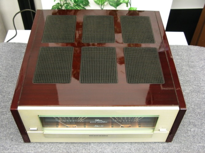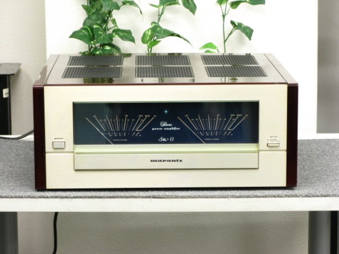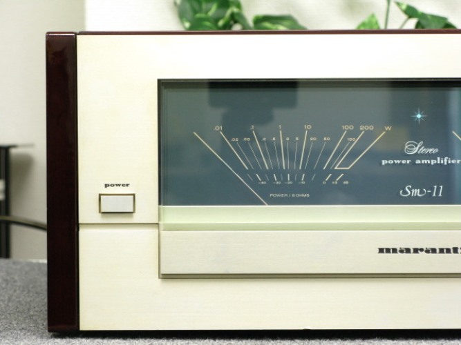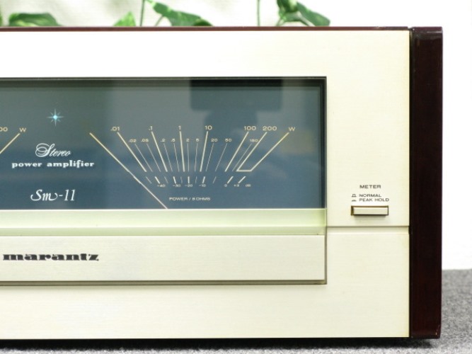 MARANTZ SM-11 VU Meter Stereo Power Amplifier รุ่นใหญ๋สุด ด้วยพลังเสียงที่สูงถึง 300 วัตต์ต่อข้าง โดดเด่นด้วยจอเข็ม VU Meter แสดงความดังของลำโพงทั้งสองข้างให้มีขนาดใหญ่มากยิ่งขึ้น เป็นแบบรวมอยู่ในช่องเดียวต่อเนื่องกัน ไม่ได้แยกออกจากกันเป็น 2 ช่องเหมือนในอดีต พร้อมทั้งเปลี่ยนสีพื้นช่องจอเข็ม VU Meter จากเดิมที่เป็นสีฟ้ามาเป็นสีน้ำเงินเข้ม ทำให้ดูเข้มเข้มทรงพลังมากยิ่งขึ้น ไม่เพียงเท่านั้นยังปรับเปลี่ยนช่องระบายความร้อนจากเดิมที่เป็นแผ่นตะแกรงโลหะมาเป็นแบบ 6 ช่อง และ 3 ช่องแทน แต่รูปแบบการดีไซน์รวมก็ยังคงสวยหรู งดงาม คลาสสิคในระดับ State of the Art ด้วยตัวเครื่องสีทอง หุ้มรอบตัวเครื่องด้วยกล่องไม้ธรรมชาติสีน้ำตาลแดงเข้มเคลือบเงา หรือ Piano Mahogany ลวดลายสวยงามเป็นอย่างยิ่ง ตัวเครื่องมีขนาดใหญ่โตมโหฬาร และหนักมากยกคนเดียวไม่ไหว กว้าง 46 สูง 20 ลึก 48 ซม. น้ำหนักประมาณ 30 กก.