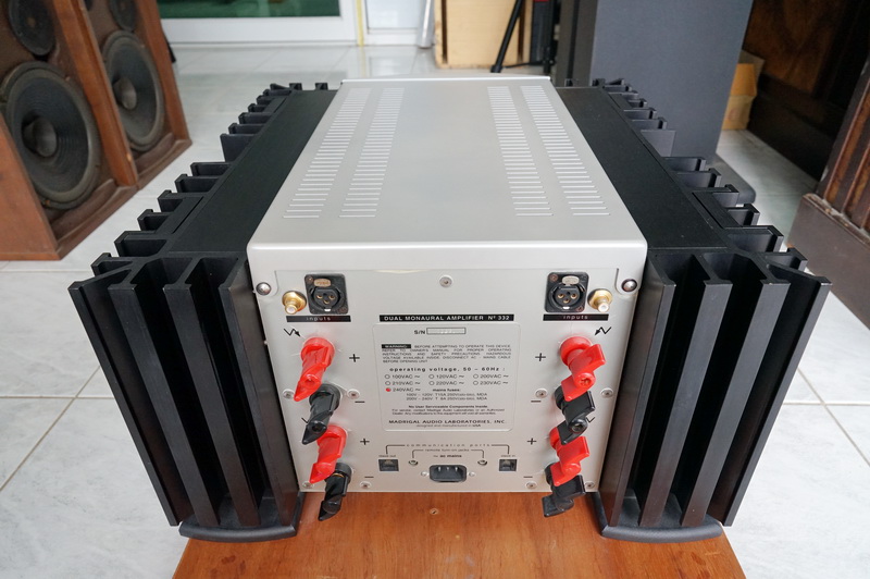 Connectivity: four custom binding posts per channel; 1 × balanced XLR input per channel; 1 × RCA input per channel; 2 × 1/8" mini-jacks for remote turn-on; 2 × Mark Levinson communication ports; high-current IEC power cord