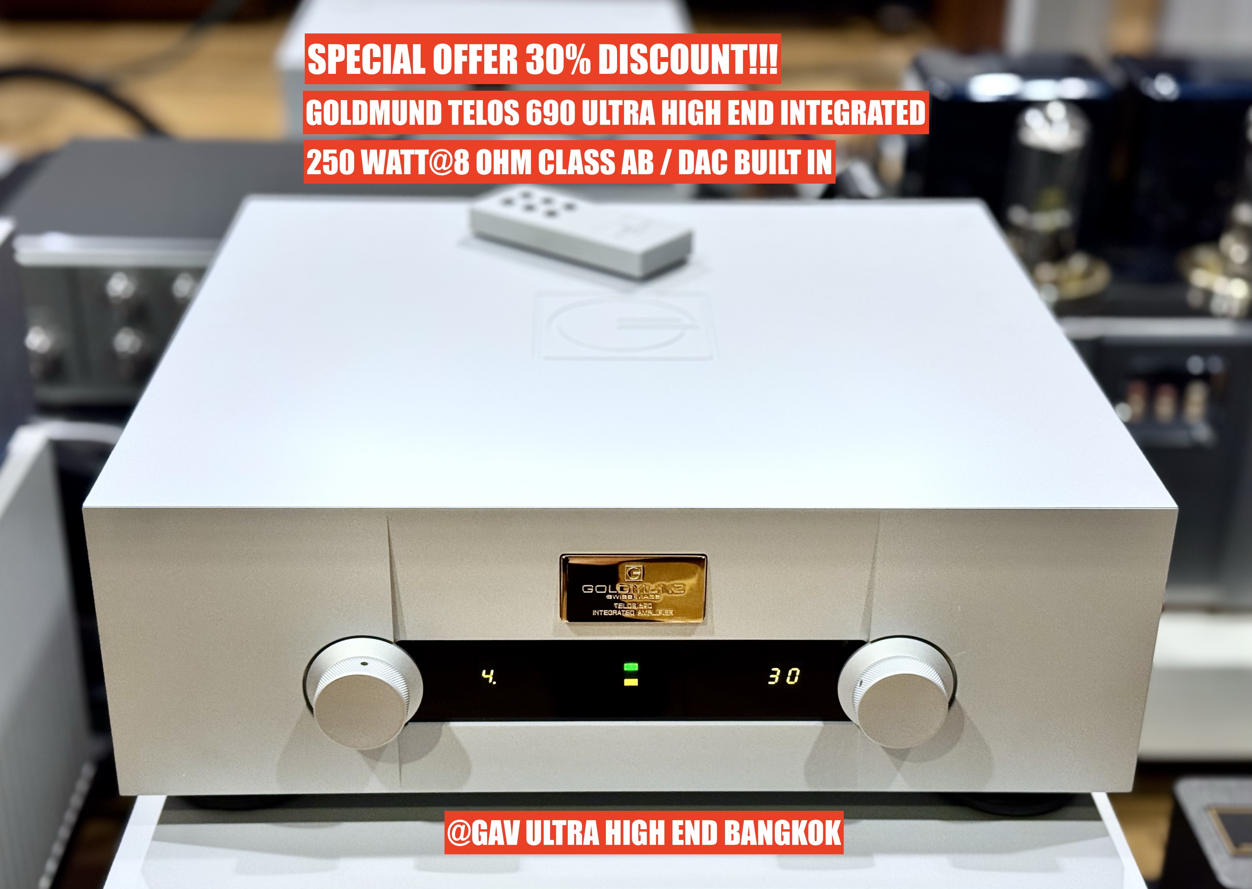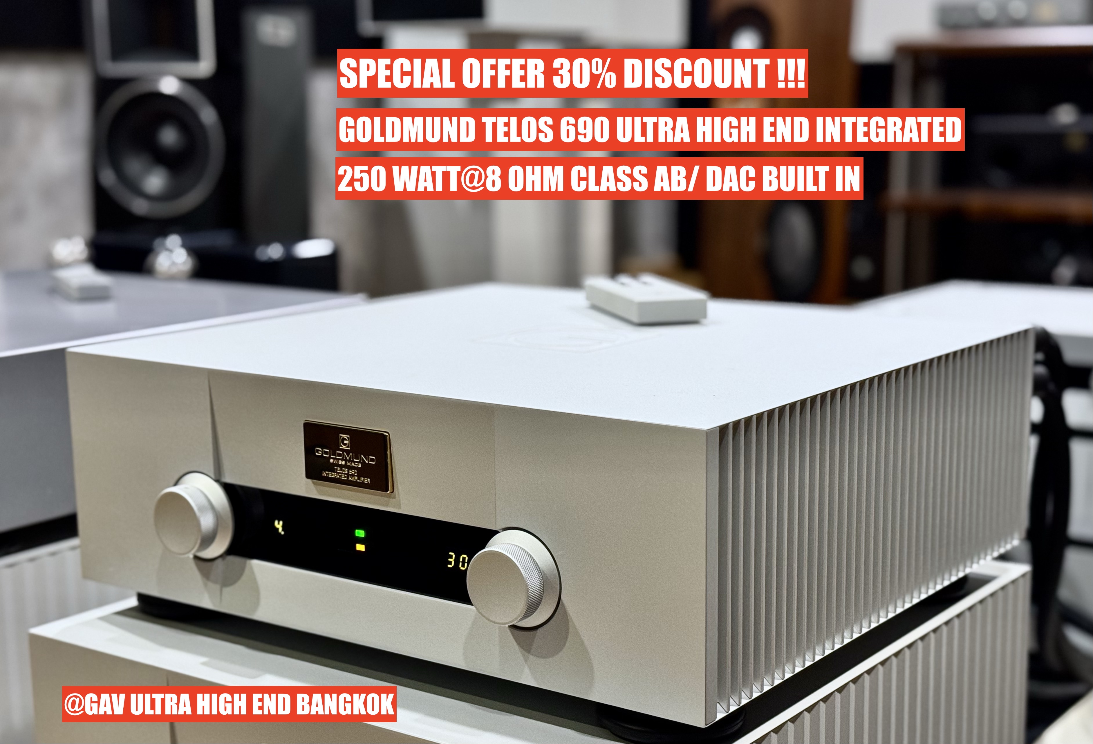 ดีกว่านี้ ไม่มีแล้วครับ โปรฯลดราคาพิเศษ 30% จากราคาปรกติ 1,350,000 บาท เหลือเพียง 950,000 บาท เท่านั้น !!! ดีกว่านี้ ไม่มีแล้วครับ GOLDMUND TELOS 690 "the World's Best Reference Ultra High End Integrated come with Hi-Res DAC built-in" , SWISS MADE SINCE 1978 ที่สุดของเครื่องอินทิเกรตระดับอัลตร้าไฮเอ็นด์ขนานแท้ที่คงแนวเสียงให้ความเป็นอนาล็อค อย่างที่หาไม่ได้ในแบรนด์อื่นๆ มาพร้อมกับการออกแบบตัวเครื่องแบบ High Precision CNC Aluminum Casing พร้อมต้นแบบระบบ Mechanical Grounding ขจัดแรงสั่นสะเทือน ความสวยงามปราณีตไร้กาลเวลา แอมป์ Class AB กำลังขับเหลือเฟือที่จะขับลำโพงทุกคู่บนโลกใบนี้ กำลังขับต่อเนื่อง 250 /320 วัตต์ที่ 8/4 โอมห์ตามลำดับ นำเข้า และ จัดจำหน่าย โดย GAV Ultra High End Bangkok โทร หรือ แอดไลน์ มาที่ 081 4423549