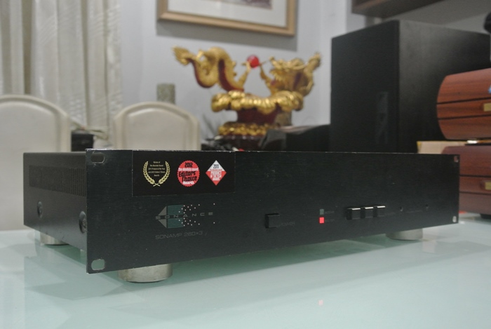 2. SONANCE Sonamp 260X3 Stereo Power Amplifier สามารถต่อลำโพงได้มากถึง 3 คู่ ด้วยพลังเสียงได้สูงสุดถึง 100 วัตต์ต่อข้าง ภายในตัวเครื่องติดตั้งแต่ชิ้นส่วน อุปกรณ์ วัสุด และวงจรที่คัดสรรมาแต่ระดับ Audio Grade รวมทั้งหม้อแปลง Toroidal ขนาดใหญ่ / Capacitor กรองไฟ 30,000 uF(15,000uF+15,000uF) ตัวเครื่องกว้าง 49 สูง 11 ลึก 33 ซม. น้ำหนักประมาณ 10 กก.