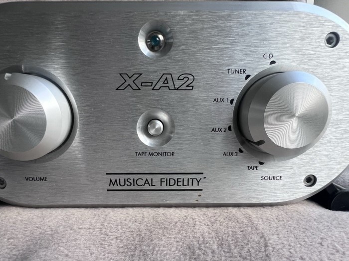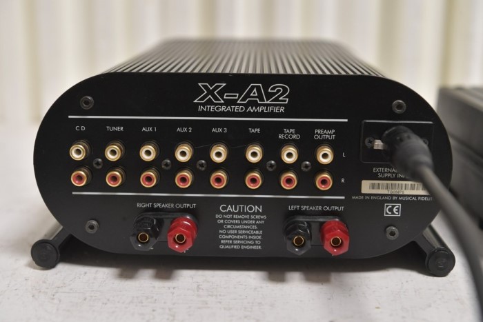 Musical Fidelity X-A2 Class A Integrated Amplifier รุ่นพิเศษที่ผลิตออกมาจำนวนจำกัดเพียงเพียงไม่กี่คู่ทั่วโลกในวาระโอกาสครบรอบ 50 ปี ที่พัฒนาปรับปรุงต่อเนื่องมาจากรุ๋นแรก A-1 ได้รับการยกย่องให้เป็น 1 ใน 10 Class A Integrated Amplifier ดีไซน์สวยโดดเด่นที่สุดในโลก โดยให้พลังเสียงได้มากถึง 75 เต็มวัตต์ต่อข้าง พร้อมพลังสำรองมากมาย สามารถต่อเชื่อมกับแหล่งเสียงหลัก ๆ ได้อย่างครบครันทั้ง Tuner, CD, Tape, Aux, Phono รูปแบบดีไซน์สวยโดดเด่นแปลกตาไม่เหมือนทั่วไป ด้วยตัวเครื่องแบนด้านข้างโค้งมนไม่ได้เป็นเหลี่ยม ไม่ได้ใหญ่โตอะไรตามสไตล์สุดยอดเครื่องเสียงจากดินแดนผู้ดีประเทศอังกฤษ กว้าง 23 สูง 11 ลึก 35 ซม. น้ำหนักประมาณ 9 กก.