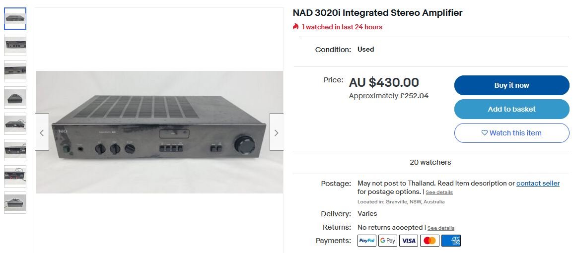 NAD 3020i สุดยอดINT AMP ฟังเพลงชั้นดี + VINTAGEสุดยอด เครื่องบ้านเรา ไฟ 220V วัตต์แท้ + วัตต์เต็มกำลังสำรองเยอะ ใช้งานปกติเหมือนใหม่ เจ้าของส่งมาฝากขายหน้าร้านถูกที่สุดเพียง 7900.-เท่านั้น*เมืองนอก+-252ปอนด์ไม่รวมภาษี+ขนส่ง(บ้านเรา+-20000.-)