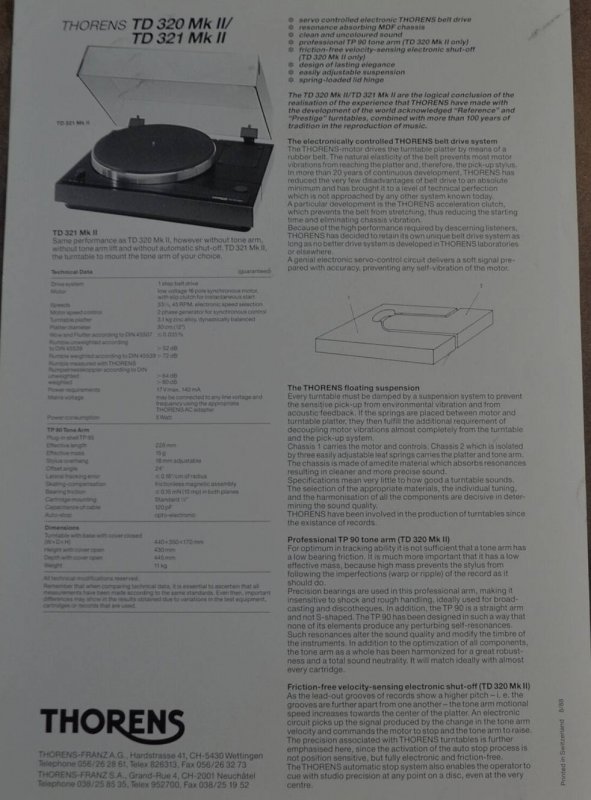 TD320 ถือเป็นรุ่นท็อปของ Thorens 300-series และได้รับการยกย่องว่าเป็นรุ่นท็อปของคลาส รุ่นแรกๆ