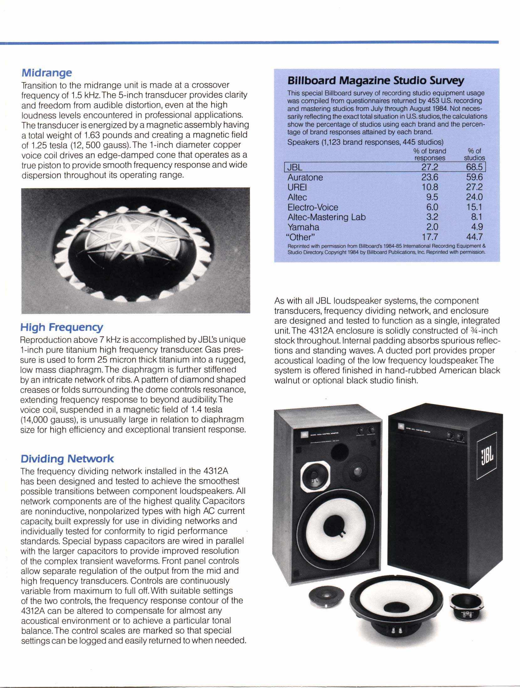 JBL 4312B MKII 1999 - 2000 รุ่นนี้มีความต่างจากรุ่น 4312 และ 4312B โดย 4312BMKII ใช้ tweeter แบบ “pure titanium dome” รุ่น 035 Ti ที่มีแมกคานิซึมและออกแบบให้ตอบสนองย่านสูงได้ดี จุดนี้คือจุดที่ “ต่างจริง” จากรุ่นแรกของ 4312 (รวมถึง 4312B)