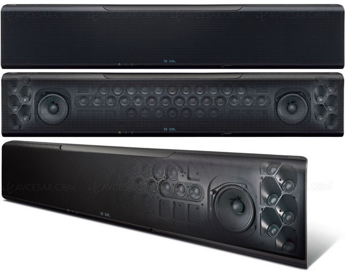 ใต้ตะแกรงของ Yamaha YSP-5600 มีลำโพงทั้งหมด 46 ตัว ประกอบด้วยลำโพงแบบอาร์เรย์ 44 ตัว และวูฟเฟอร์ 2 ตัว ในจำนวนนี้ มีลำโพงแบบอาร์เรย์ 12 ตัวที่ใช้เป็นช่องสัญญาณ 'สูง' โดยมีไดรเวอร์ยิงเสียงขึ้นด้านบน 6 ตัวในแต่ละด้าน ซึ่งจะสะท้อนเสียงจากเพดานในมุมที่พอเหมาะ ทำให้เสียงเหมือนมาจากด้านบน