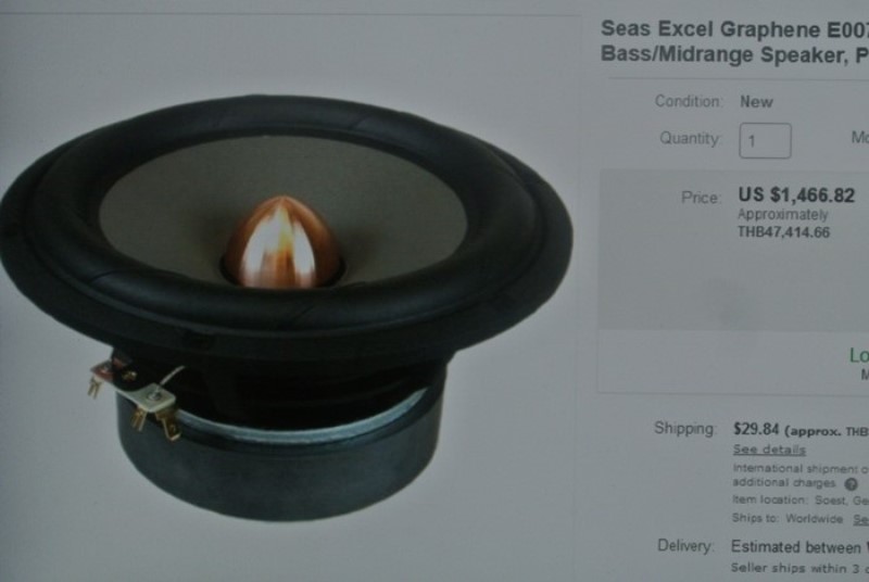 ราคาแค่ดอกลำโพง SEAS เสียงทุ้มคู่เดียวใน e-bay ต่างประเทศก็เกินคุ้มแล้ว เพราะขายกันแพงมากร่วม 48,000 บาท(US $1,466.82) ยังไม่รวมภาษีฯ และค่าขนส่ง 3,000 บาท