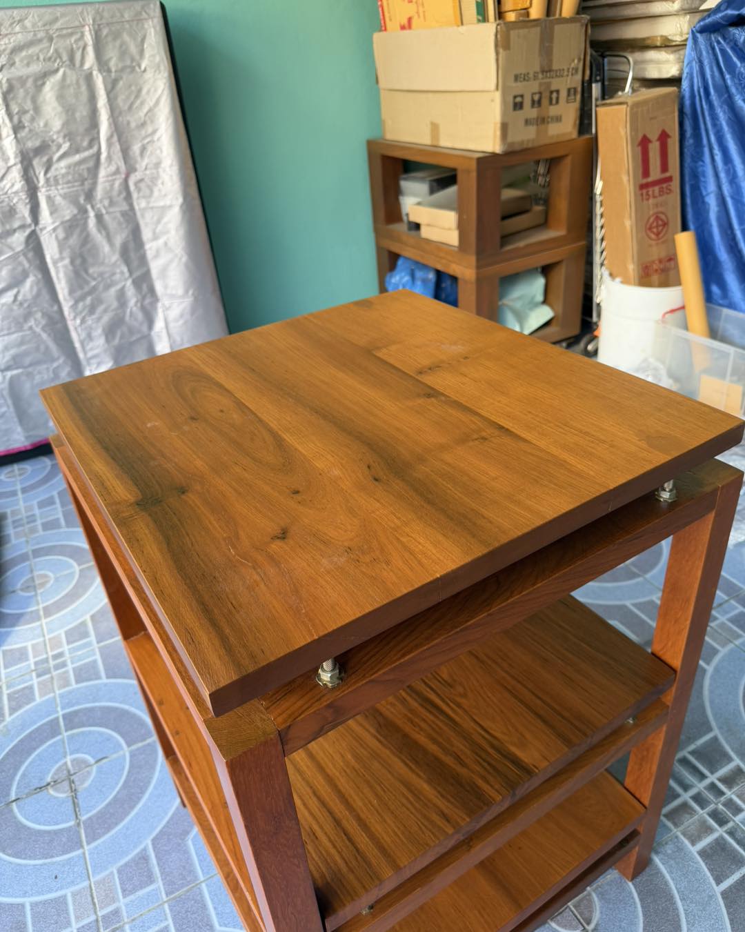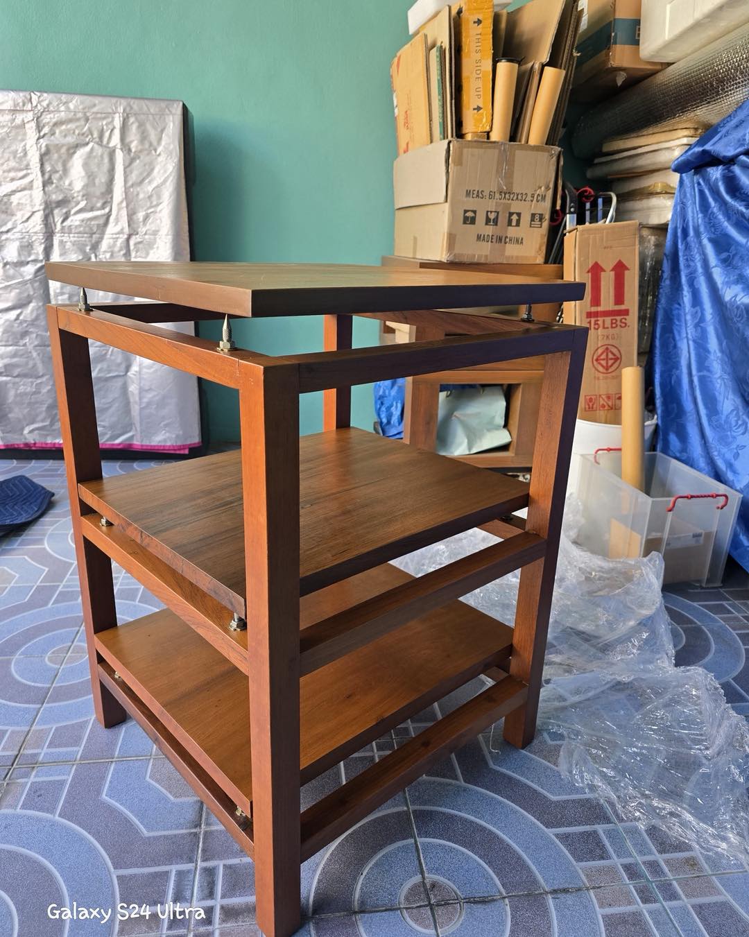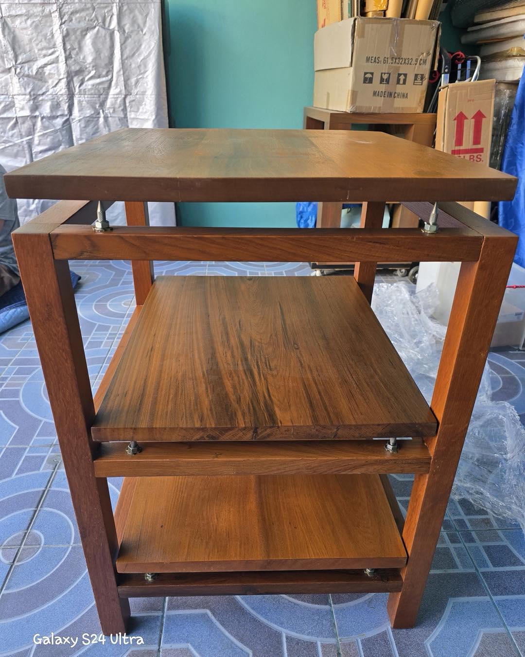 ชั้นวางเครื่องเสียงไม้สักแท้แบบสามชั้น แต่ละชั้นมีสไปค์ วางแผ่นไม้บนสไปค์อีกที ให้เสียงนิ่งสงัดกว่าชั้นไม้แบบปรกติ