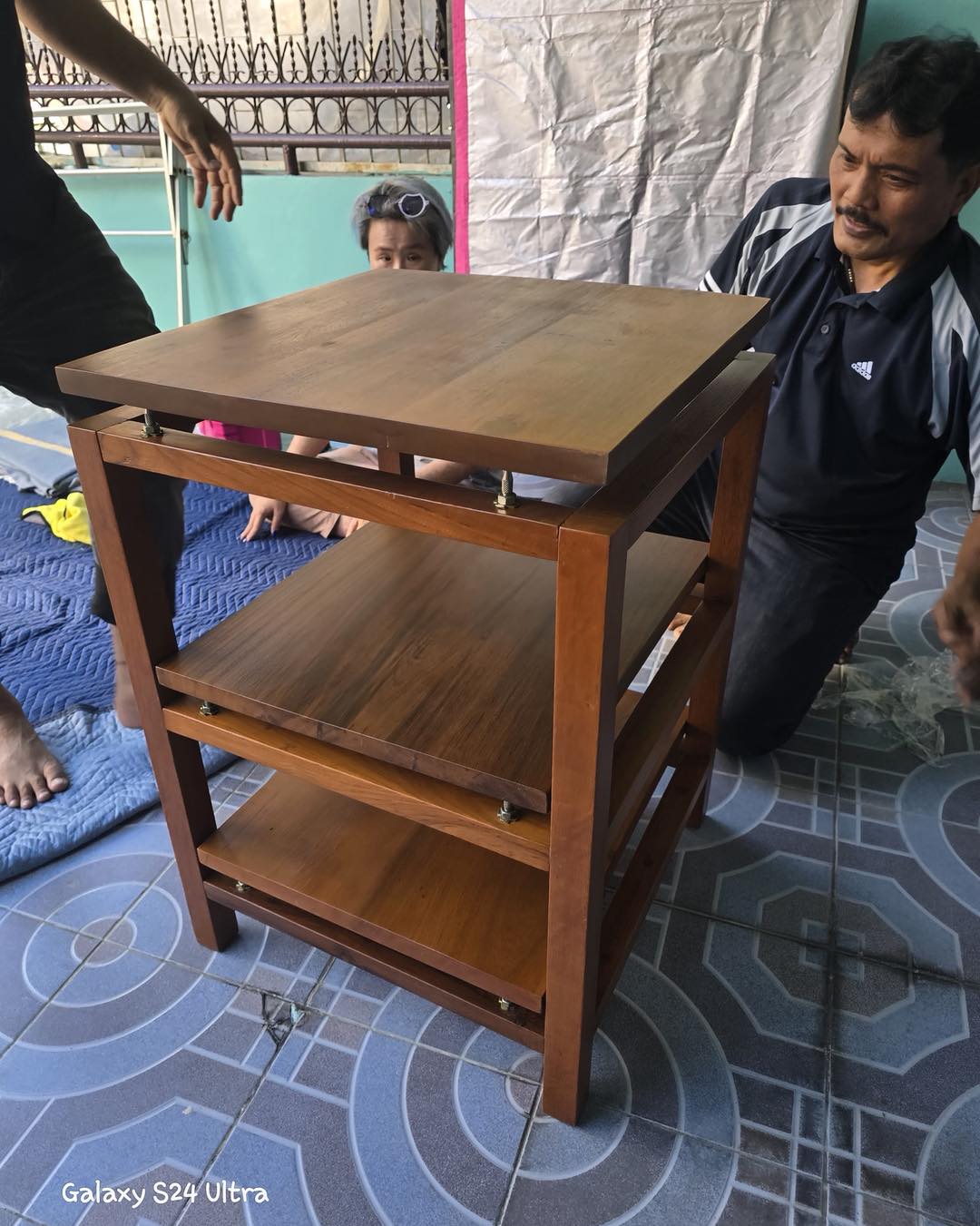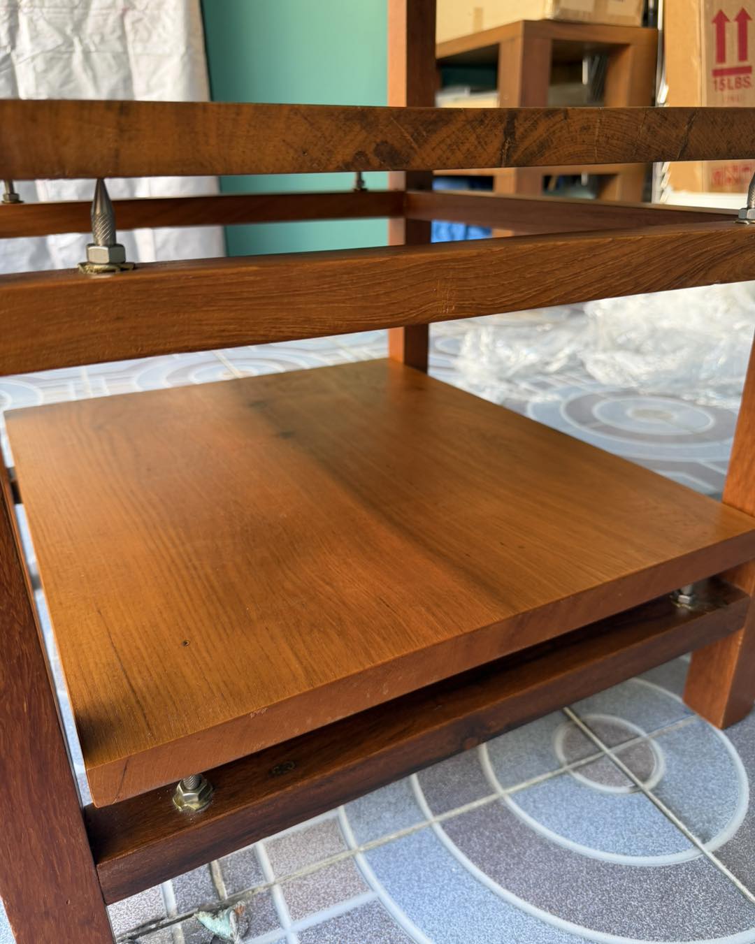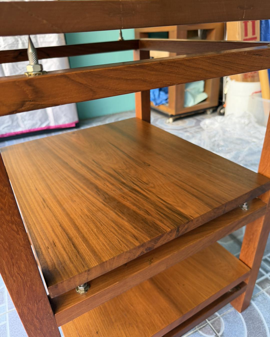 ชั้นวางเครื่องเสียงไม้สักแท้แบบสามชั้น แต่ละชั้นมีสไปค์ วางแผ่นไม้บนสไปค์อีกที ให้เสียงนิ่งสงัดกว่าชั้นไม้แบบปรกติ