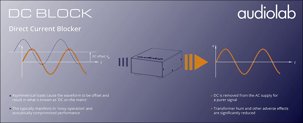 1. Audiolab DC BLOCK จะทำการแปลงและปล่อยให้ “เฉพาะ” กระแสไฟ AC ผ่านตัวมันไปเท่านั้น จะไม่ยอมให้กระแสไฟตรง (DC) ผ่านไป ดังนั้น ถ้าไฟเอซีจากปลั๊กไฟบนผนังห้องมีกระแสไฟ DC ปะปนเข้ามากับไฟ AC กระแสไฟ DC จะถูกกักไว้ที่ “อินพุต” ของทรานฟอร์เมอร์ซึ่งมีลักษณะเป็นขดลวดตัวนำ (ขดลวดปฐมภูมิ) และเมื่อกระแสไฟ DC ที่มากับไฟ AC ถูกกักอยู่ที่ขดลวดปฐมภูมิมากๆ เข้า ขดลวดก็จะเกิดการอิ่มตัว (saturated) ทำให้ประสิทธิภาพในการแปลงไฟเอซีลดลง ส่งผลต่อเนื่องไปถึงกำลังของภาคจ่ายไฟที่ไม่เต็มประสิทธิภาพ และอาจจะกลายเป็นเสียงฮัมหรือหึ่งขึ้นมารบกวนได้