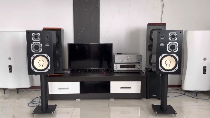 YAMAHA NS-100M ลำโพงระดับโลกรุ่นพิมพ์นิยมแบบ Bookshelve วางหิ้ง 3 ทางระดับ Natural Sound Studio Monitor มีขนาดใหญ่ และหนักกว่าลำโพงทั่วไปอย่างมาก ติดตั้ง Woofer ขนาด 8 นิ้ว กรวยกระดาษ เอกสิทธิ์เทคโนโลยีของ Yamaha ที่สามารถคิดค้นวัตถุดิบที่ให้น้ำเสียงแที่แม่นยำ ตอบสนองความพี่ได้ผิดเพี้ยนน้อยที่สุด โดย Voice Coil ใช้ทองแดงแบบที่มีลักษณะแบน เพื่อให้เกิดความร้อนที่ตัวว๊อยซ์คอยล์ให้ต่ำที่สุด และ Midrange ขนาด 2.5 นิ้วกรวยแบบ Dome โดยด้านหลัง Diaframe ใช้วัสดุ Rockwool เพื่อซับเสียงที่มารบกวนการฟังที่เกิดจากภายในตัวตู้ได้อย่างยอดเยี่ยม รวมทั้ง Tweeter ขนาด 1.5 นิ้ว ใช้ Aluminum Voice Coil ที่มีน้ำหนักเบา และตอบสนองความถี่ได้ดีเยี่ยม สามารถรองรับพลังเสียง 100 วัตต์เต็มต่อข้าง ความไวต่อเสียง 90dB เล่นร่วมกับเครื่องเสียงได้ทุกประเภท รวมทั้งแอมป์หลอดวัตต์ต่ำได้อย่างยอดเยี่ยม