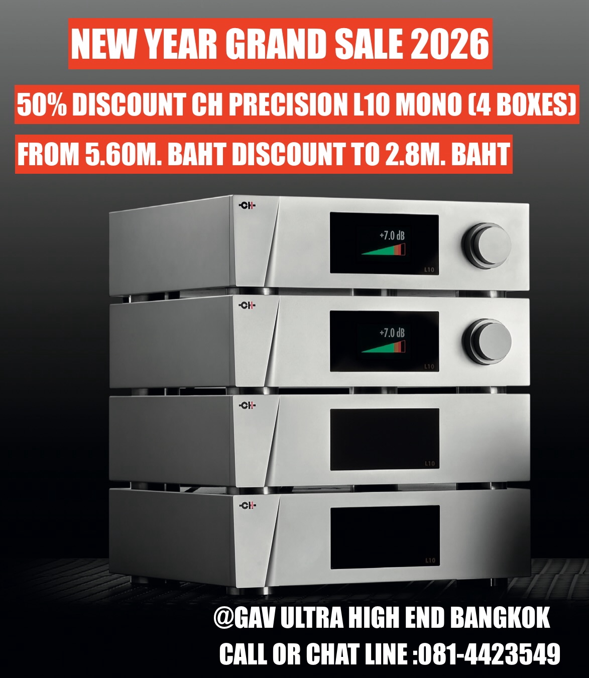 New Year SALE 50% Discount !!! ลดราคารับปีใหม่ 2569/2026 ถูกกว่านี้ไม่มีแล้ว SALE 50% Discount !!! CH PRECISION L10 MONO ถูกกว่านี้ ไม่มีแล้วครับ BIG Discount on Current Flagship CH PRECISION 10 Series , 1 set(4 boxes) L10 MONO separate PSU one for each channel and separate Left/Right signal. Special BIG Discount from Standard local Thai Baht price 5,600,000 BAHT/SET to 2,800,000 BAHT/SET !!! นำเข้า และ จัดจำหน่าย โดย GAV Ultra High End Bangkok โทร หรือ แอดไลน์ มาที่ 081 4423549
